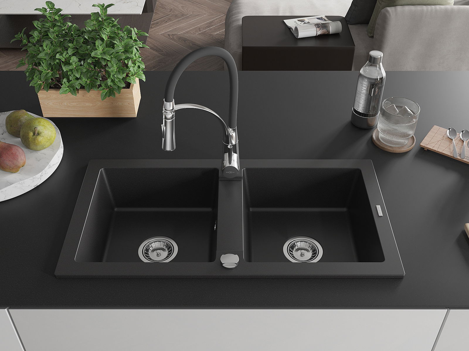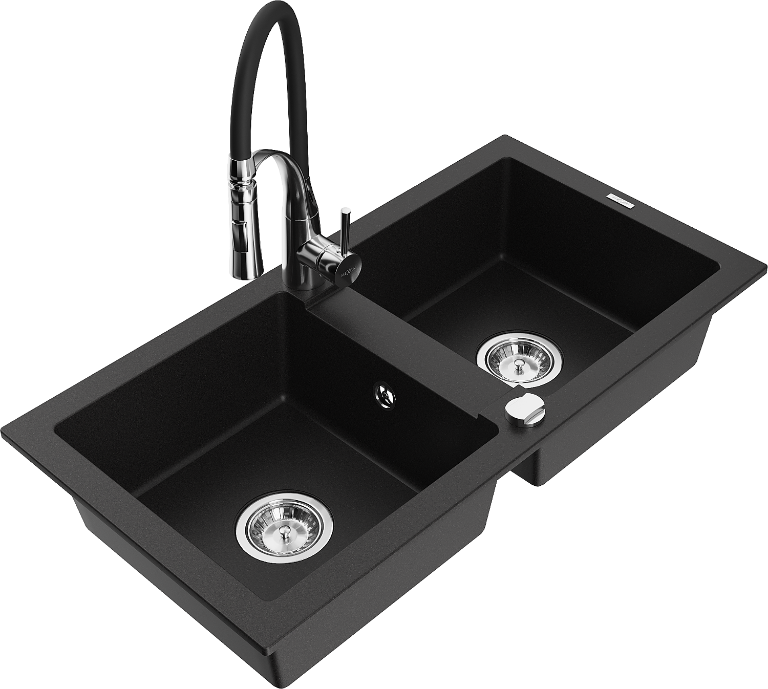 Mexen Mario zlewozmywak granitowy 2-komorowy z baterią kuchenną Aster, czarny - 6504-77-73450-07