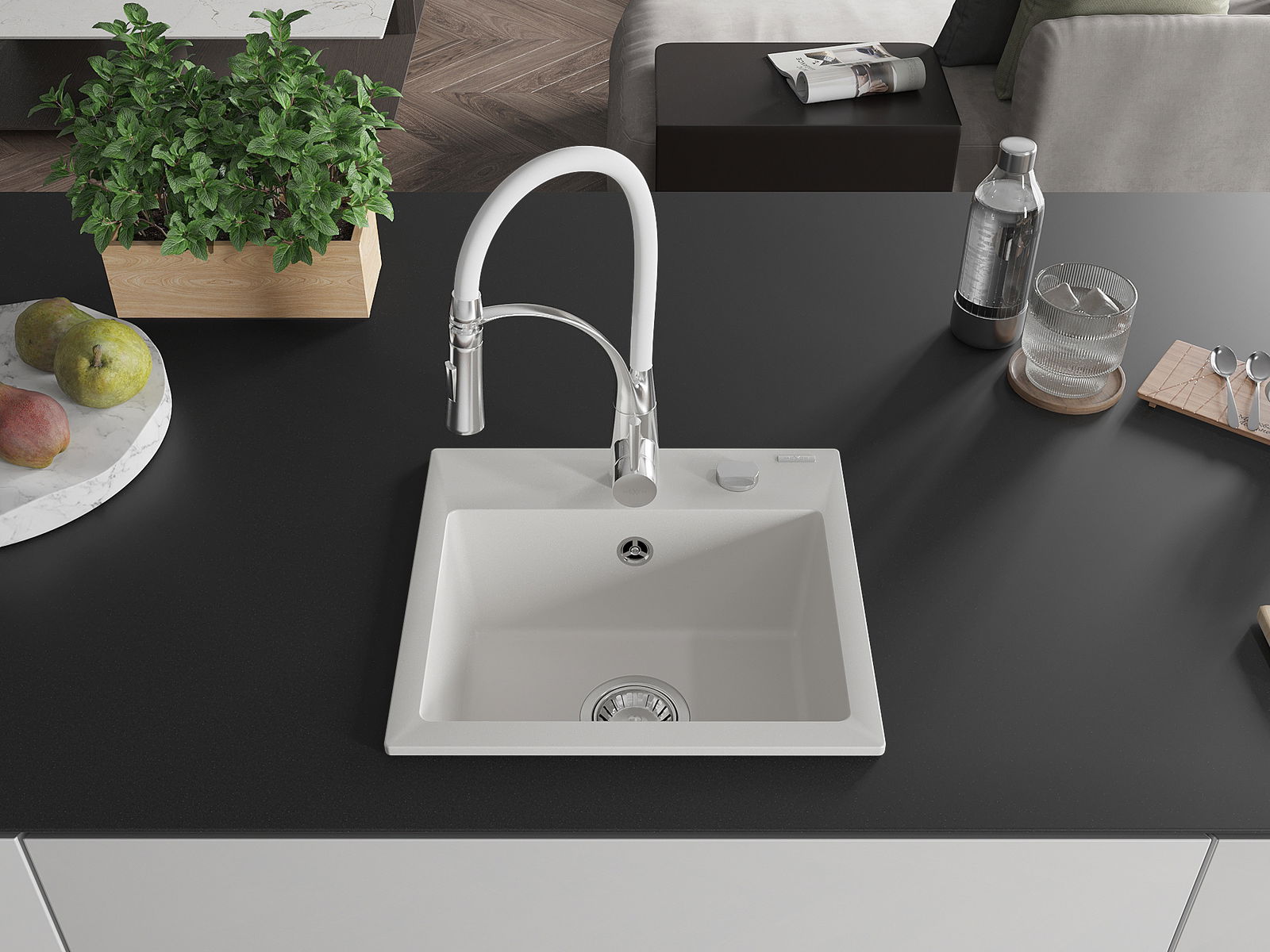 Zlew posiada podfrezowany otwór o średnicy 35 mm do samodzielnego wybicia. Można go wykorzystać m.in. do montażu dozownika na płyn, który wyeliminuje obecność plastikowych butelek w kuchni i nada jej eleganckiego wykończenia.