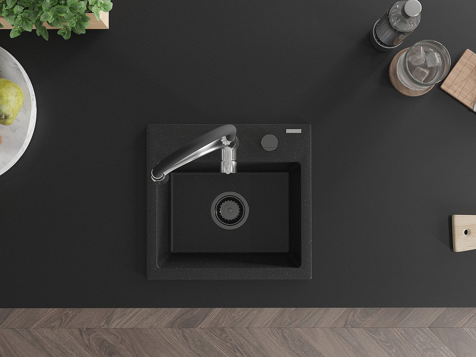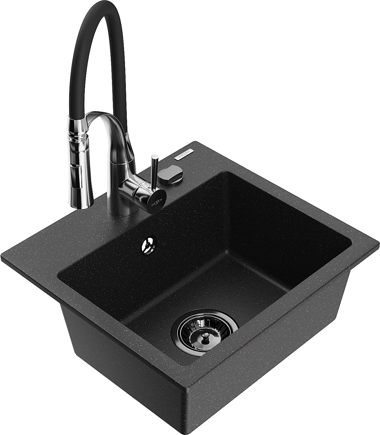 Mexen Milo zlewozmywak granitowy 1-komorowy z baterią kuchenną Aster, czarny/srebrny metalik - 6505-73-73450-07-B
