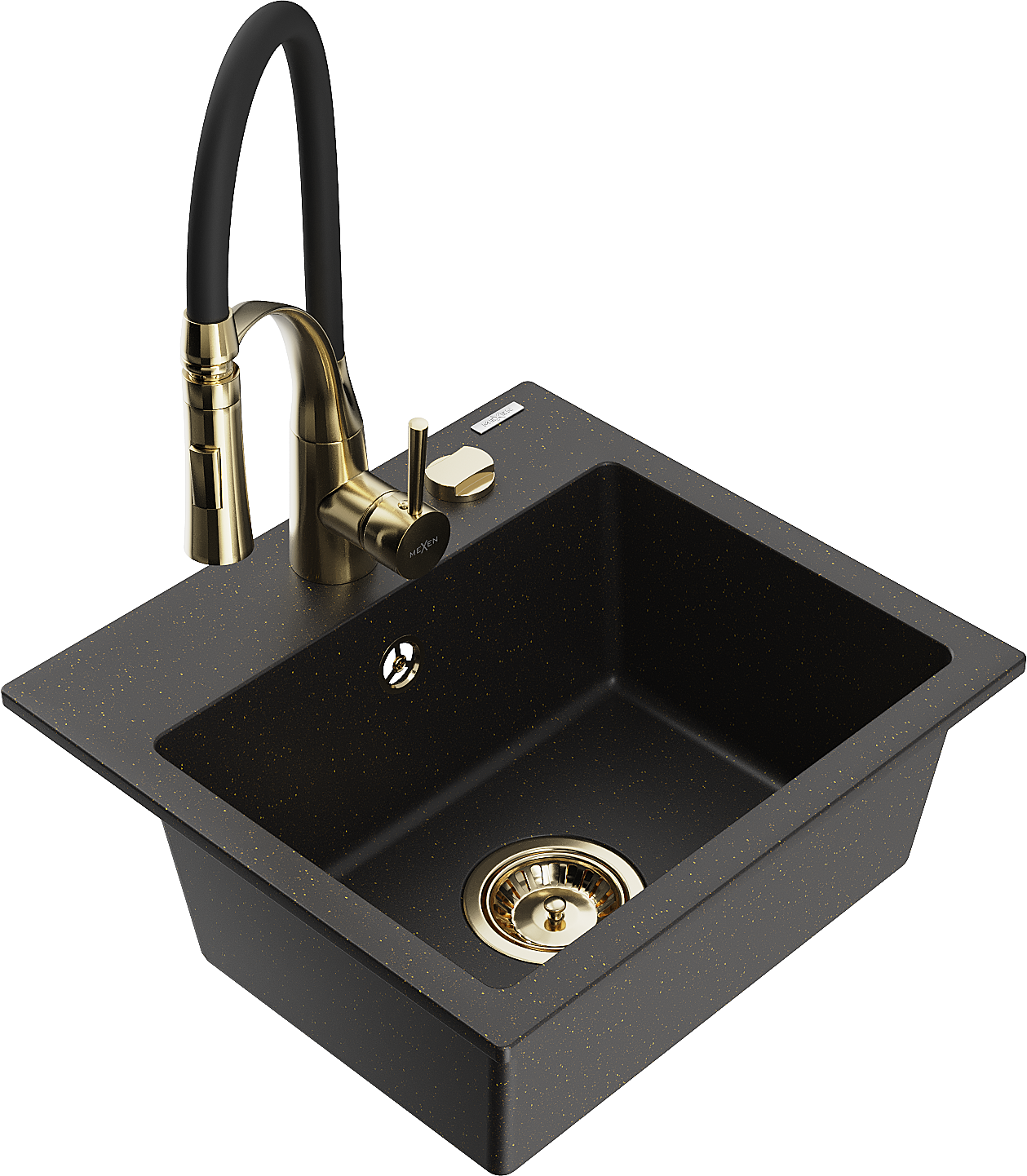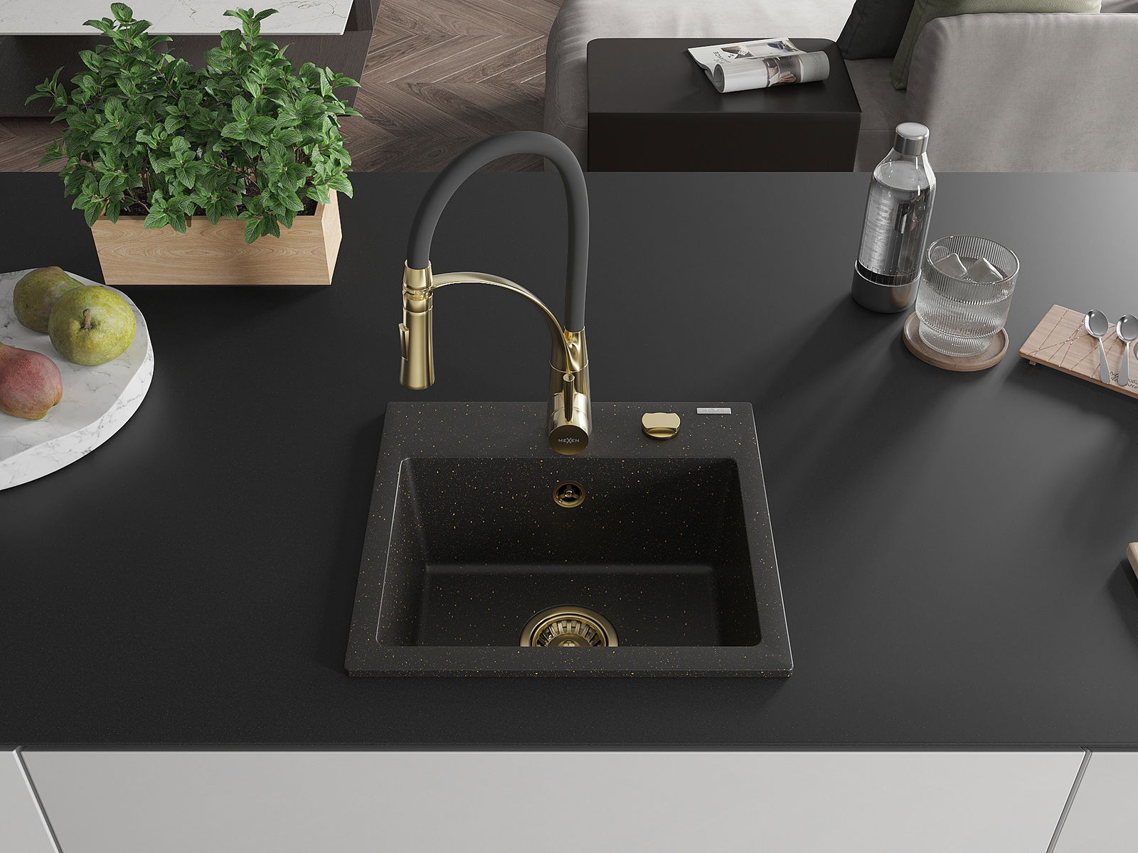 Mexen Milo zlewozmywak granitowy 1-komorowy z baterią kuchenną Aster, czarny/złoty metalik - 6505-75-73450-57-G