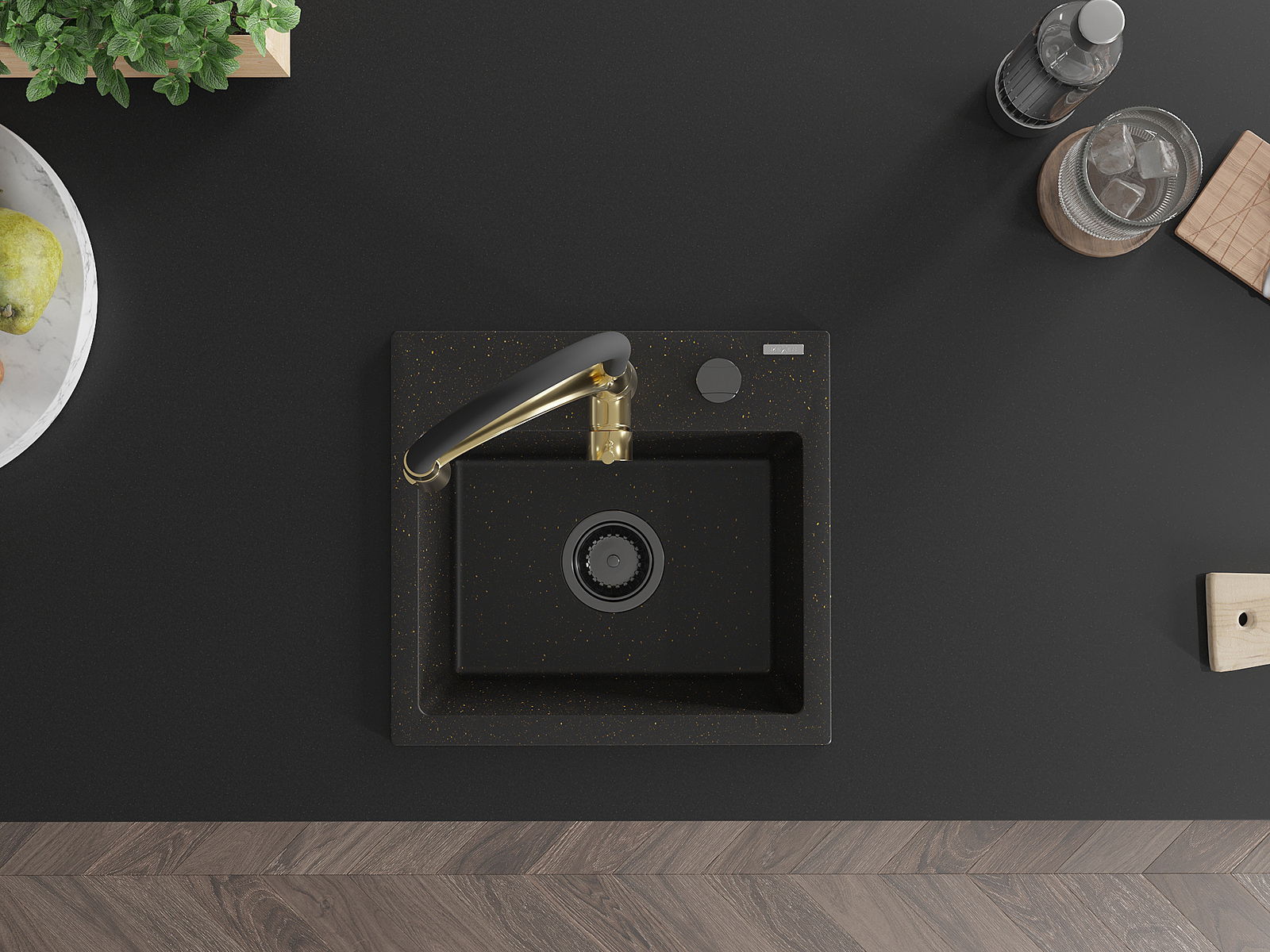 Mexen Milo zlewozmywak granitowy 1-komorowy z baterią kuchenną Aster, czarny/złoty metalik - 6505-75-73450-57-B