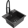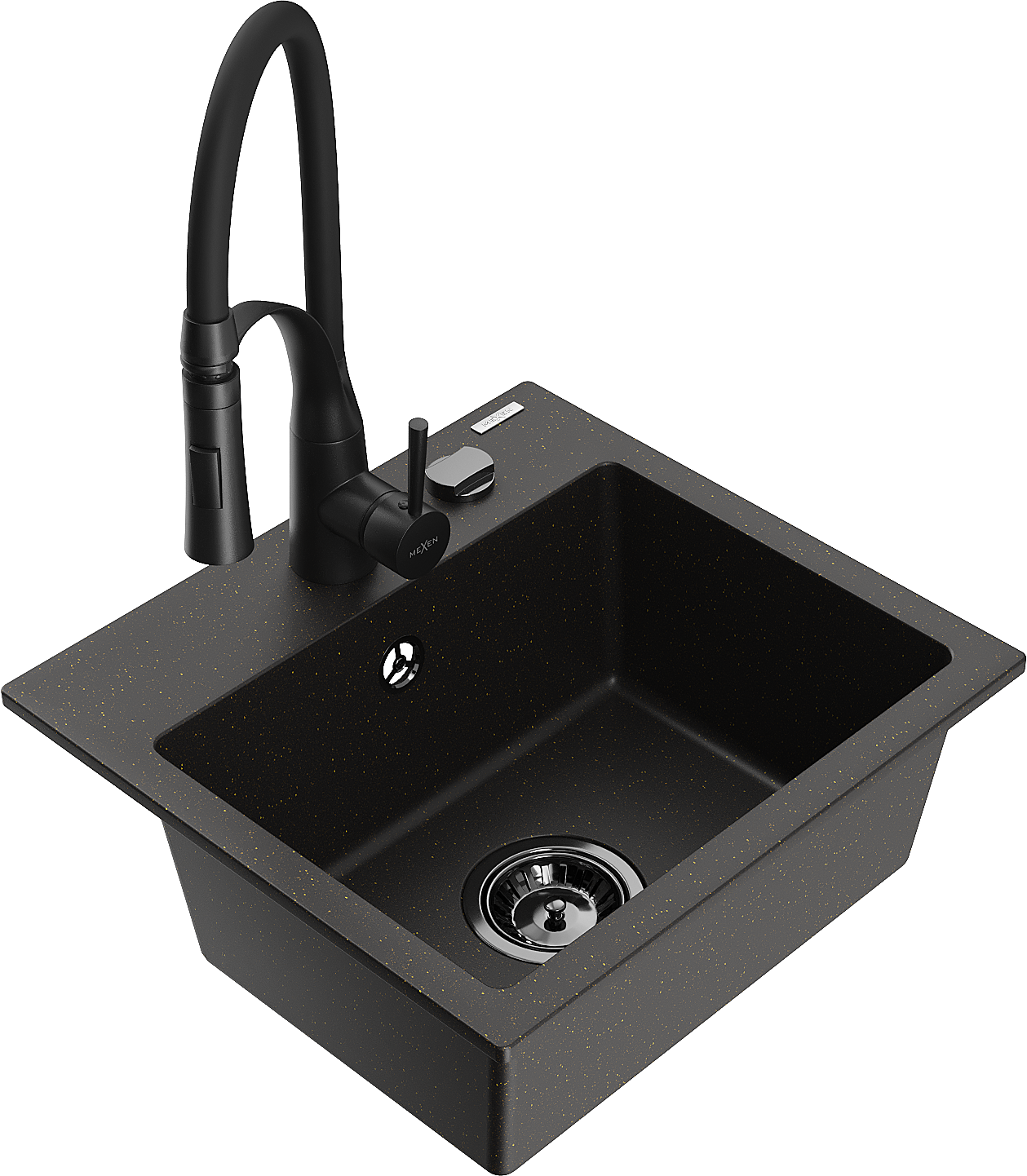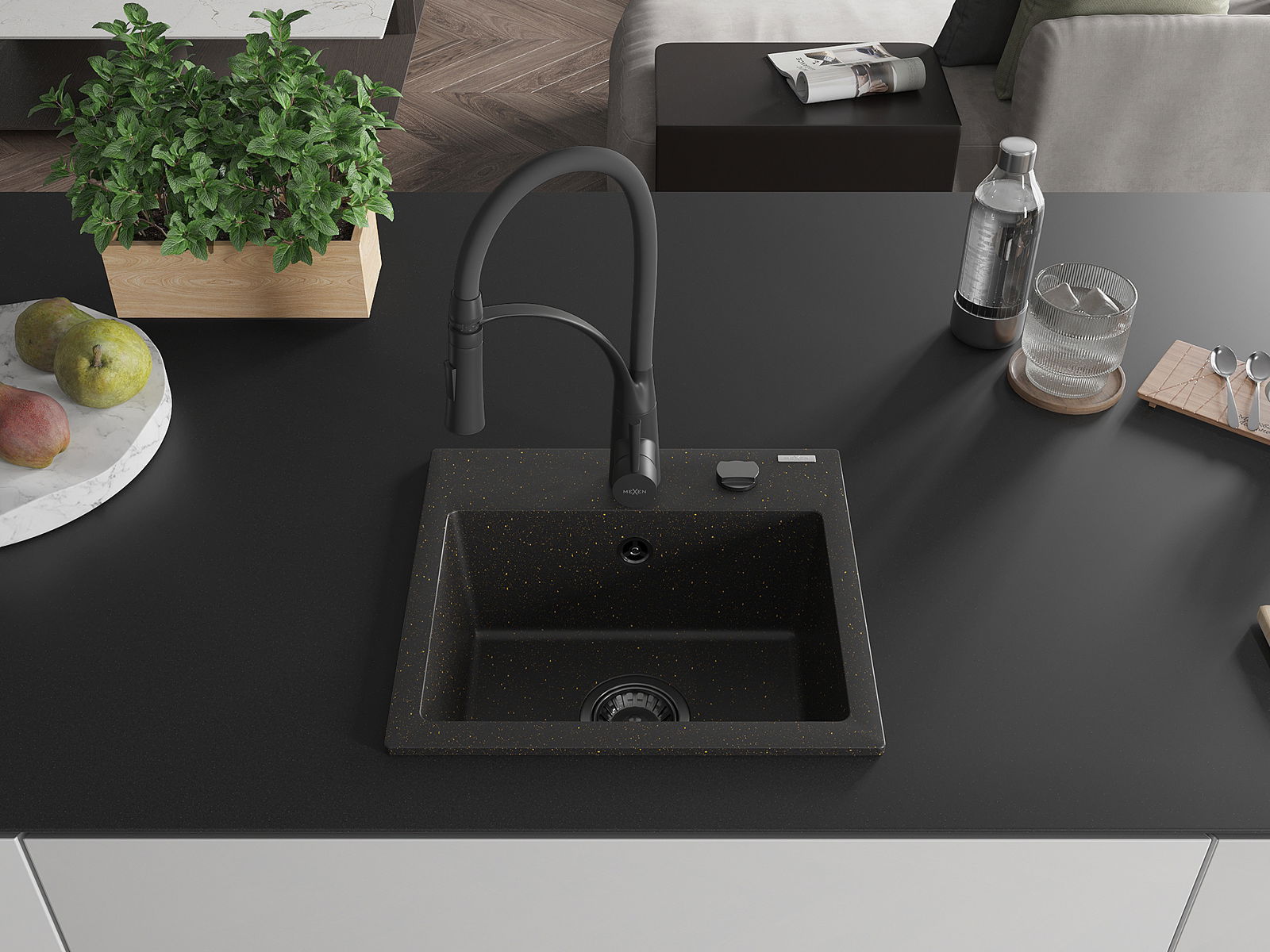Mexen Milo zlewozmywak granitowy 1-komorowy z baterią kuchenną Aster, czarny/złoty metalik - 6505-75-73450-70-B