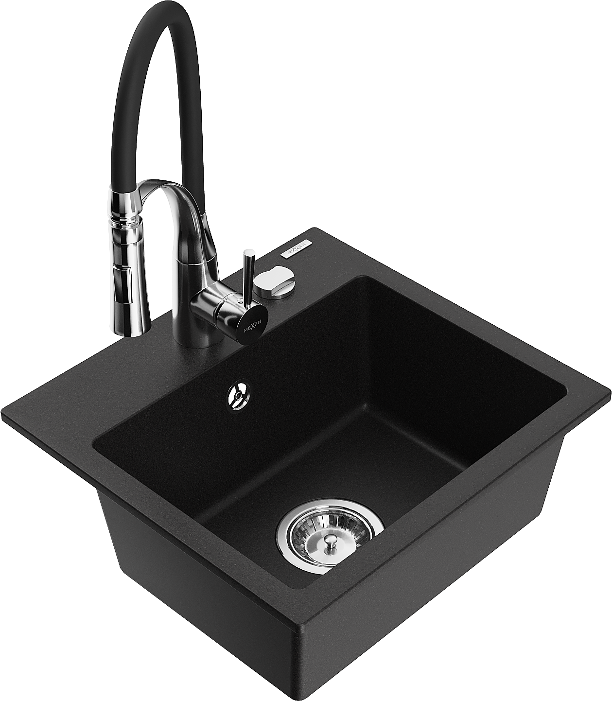 Mexen Milo zlewozmywak granitowy 1-komorowy z baterią kuchenną Aster, czarny - 6505-77-73450-07