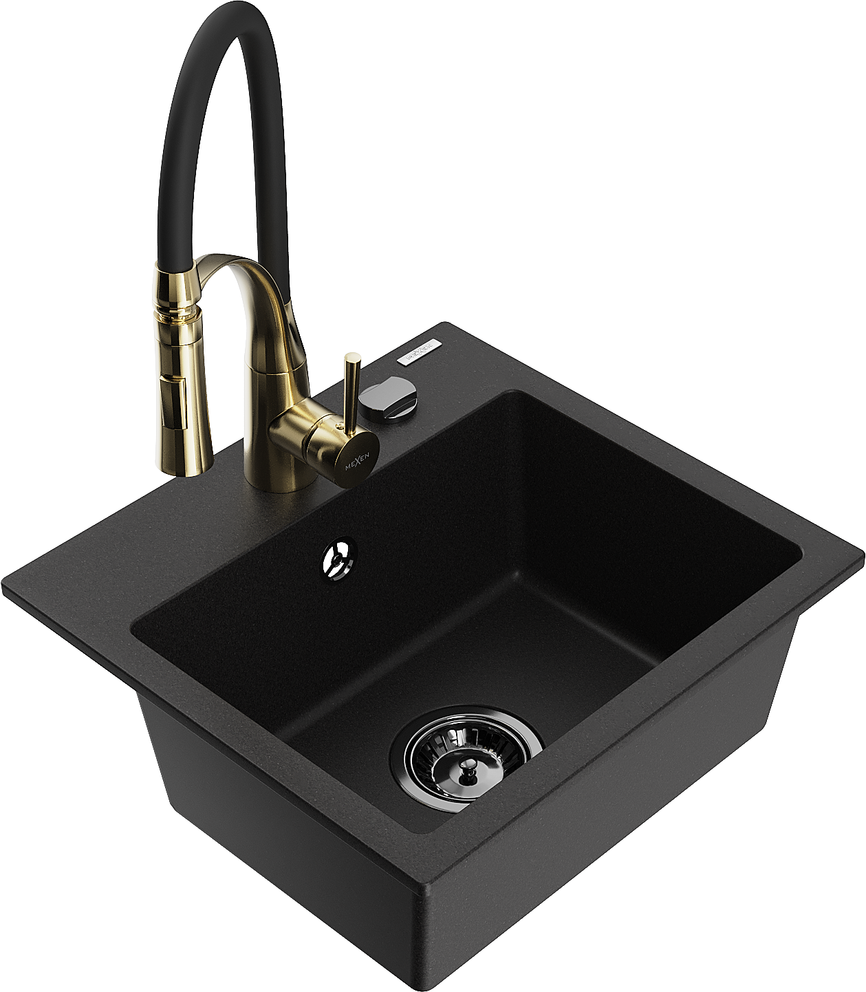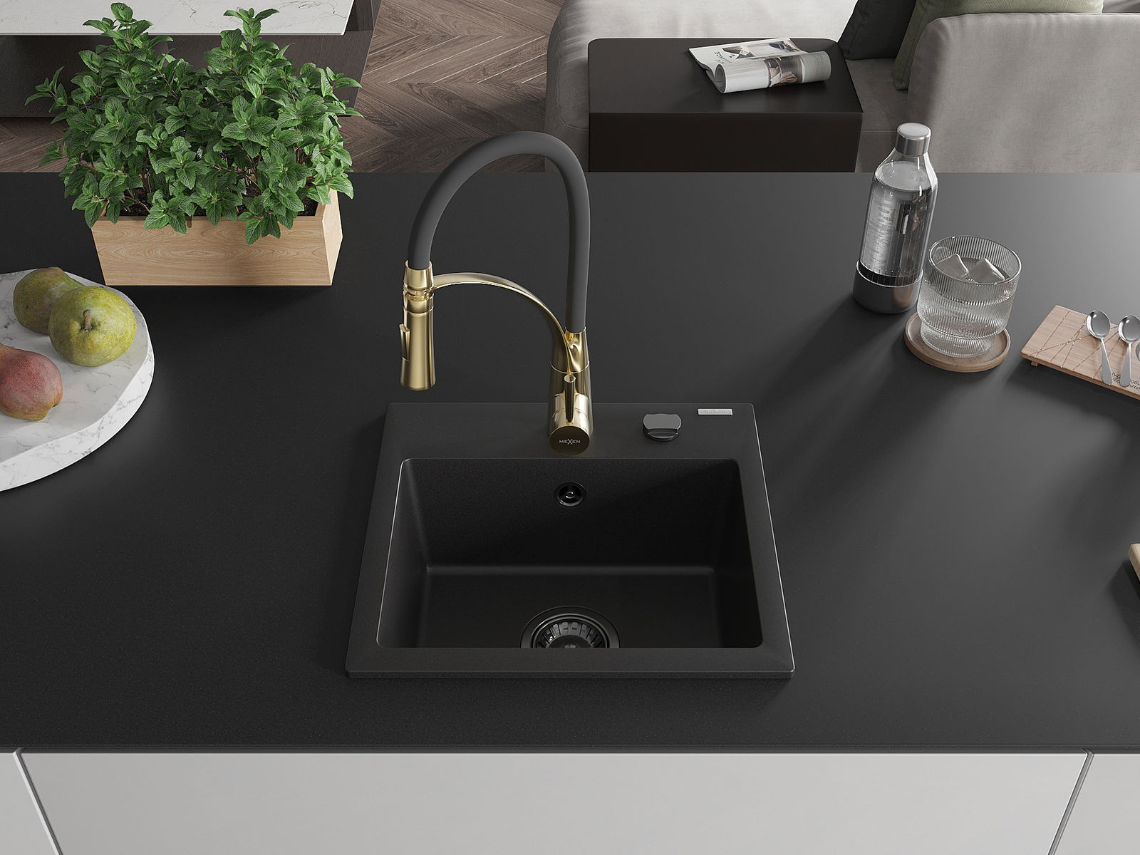 Mexen Milo zlewozmywak granitowy 1-komorowy z baterią kuchenną Aster, czarny - 6505-77-73450-57-B