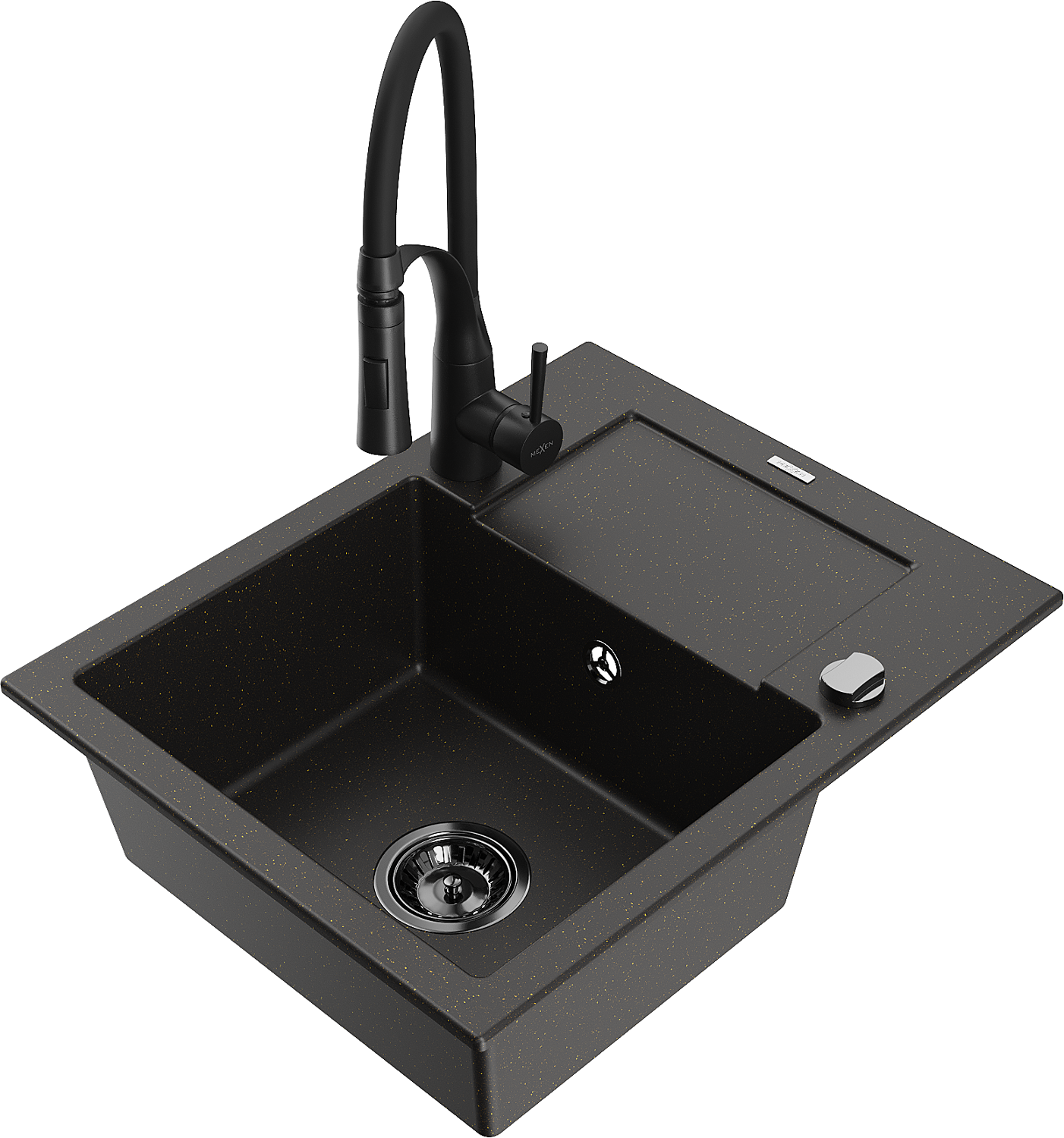 Mexen Enzo zlewozmywak granitowy 1-komorowy z ociekaczem i baterią kuchenną Aster, czarny/złoty metalik - 6506-75-73450-70-B