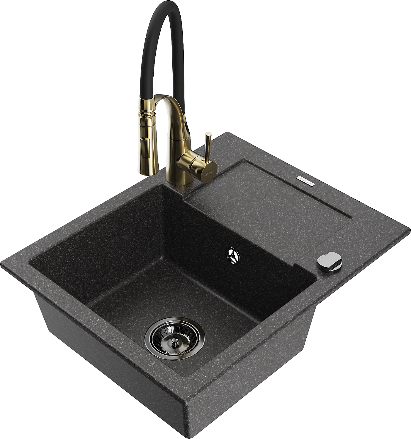 Mexen Enzo zlewozmywak granitowy 1-komorowy z ociekaczem i baterią kuchenną Aster, czarny nakrapiany - 6506-76-73450-57-B