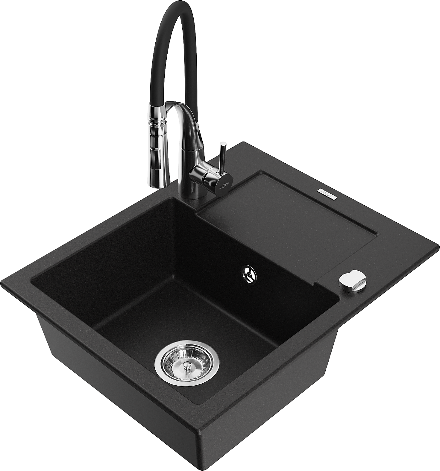 Mexen Enzo zlewozmywak granitowy 1-komorowy z ociekaczem i baterią kuchenną Aster, czarny - 6506-77-73450-07