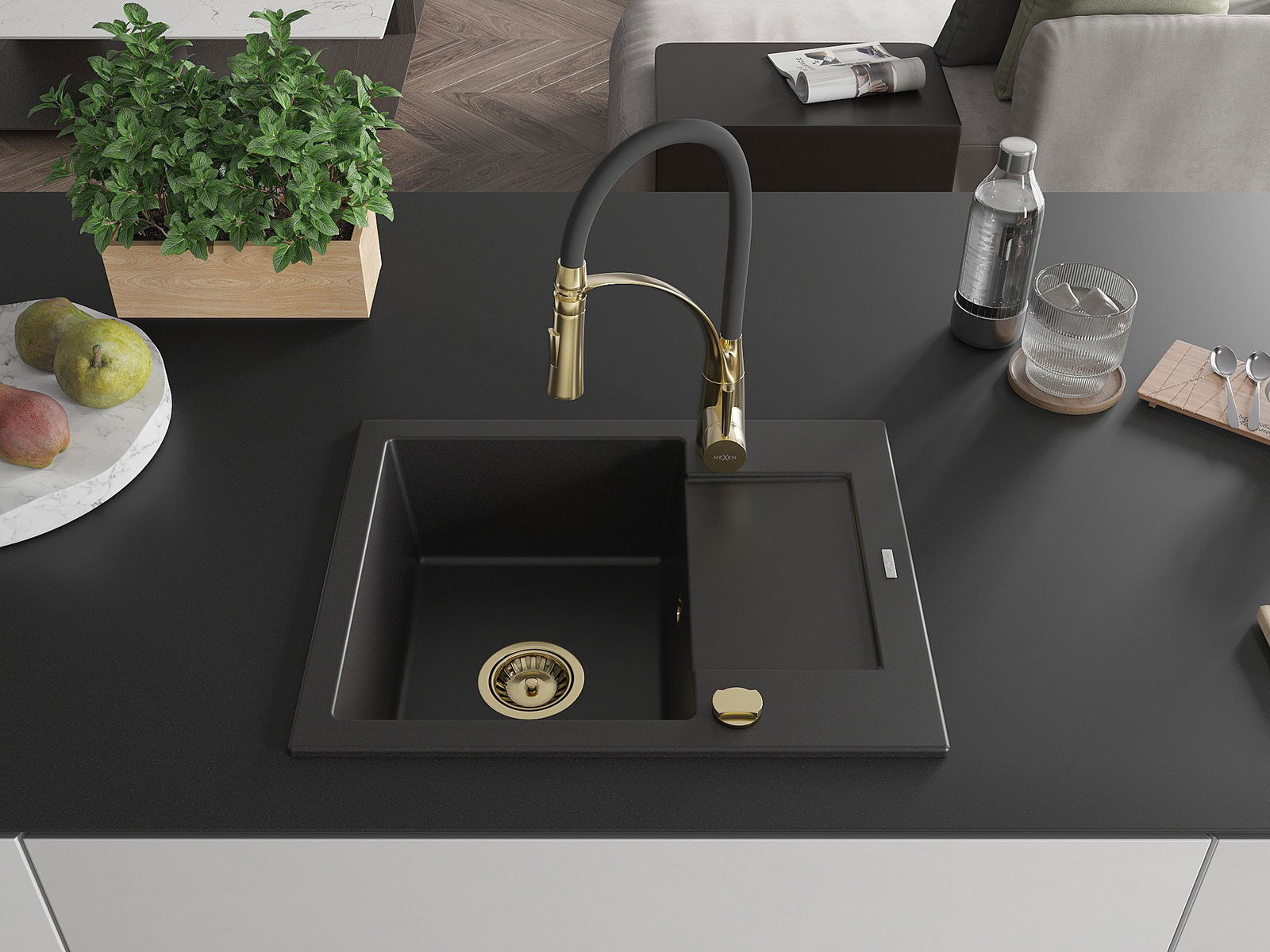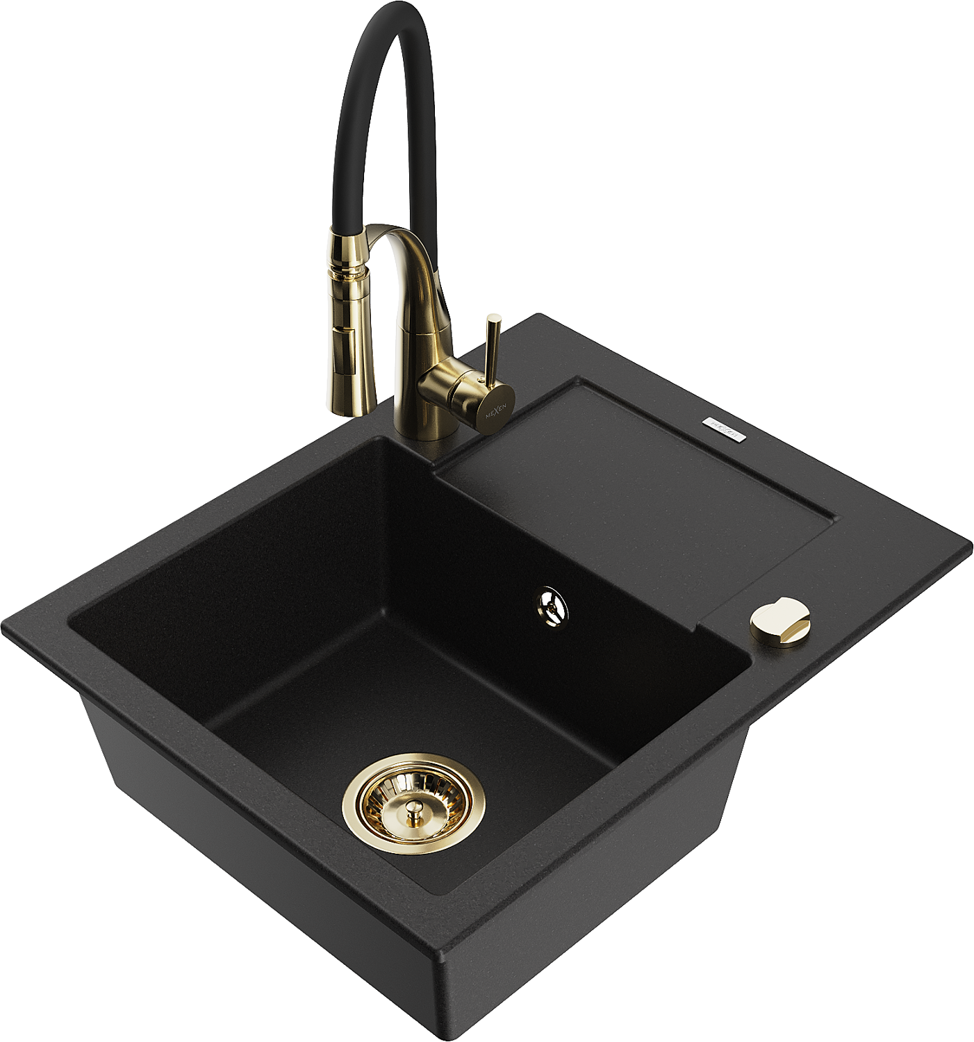 Mexen Enzo zlewozmywak granitowy 1-komorowy z ociekaczem i baterią kuchenną Aster, czarny - 6506-77-73450-57-G