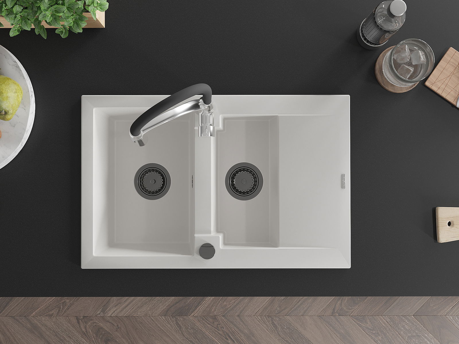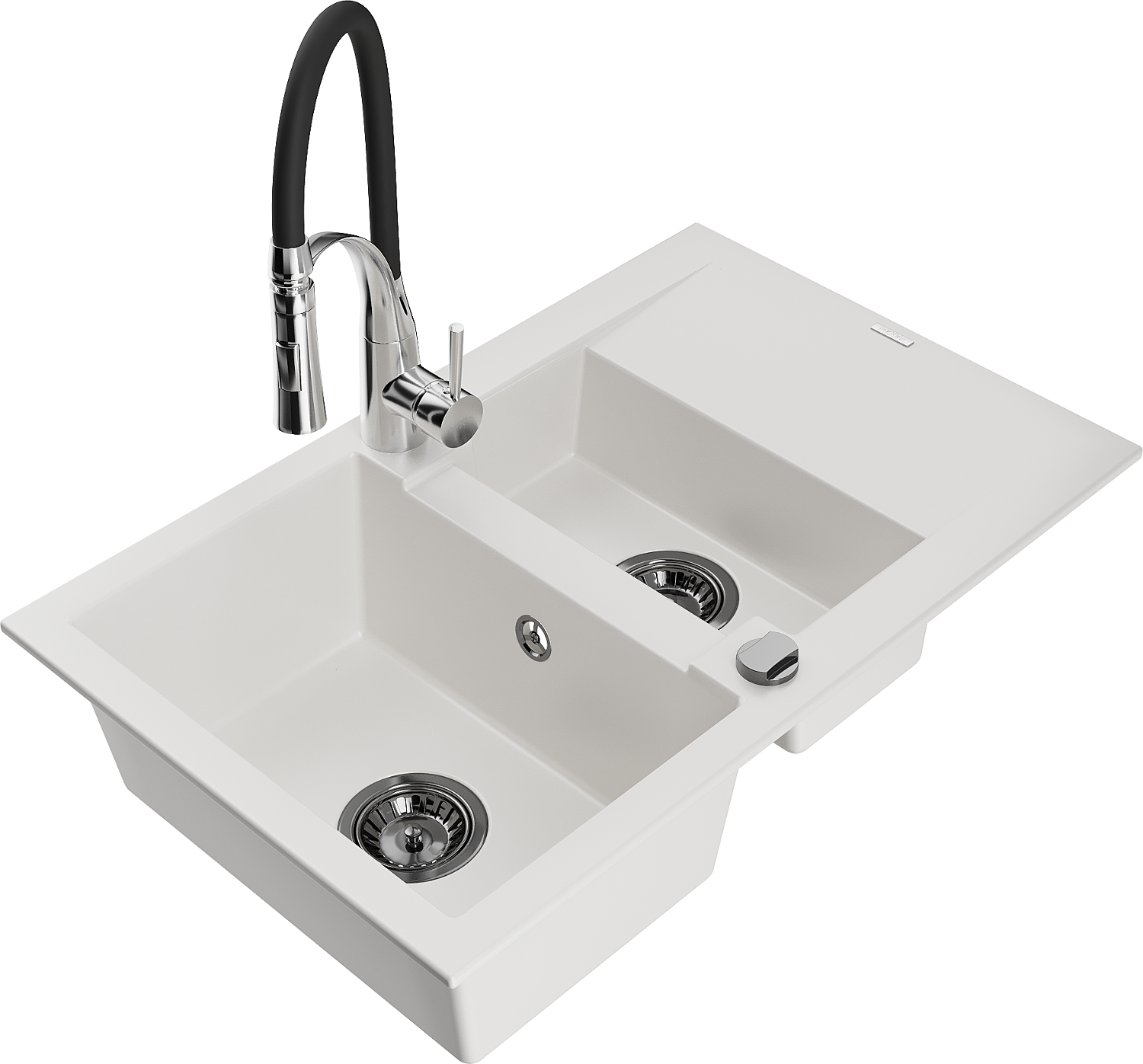 Mexen Gaspar zlewozmywak granitowy 1,5-komorowy z ociekaczem i baterią kuchenną Aster, biały - 6507-20-73450-07-B