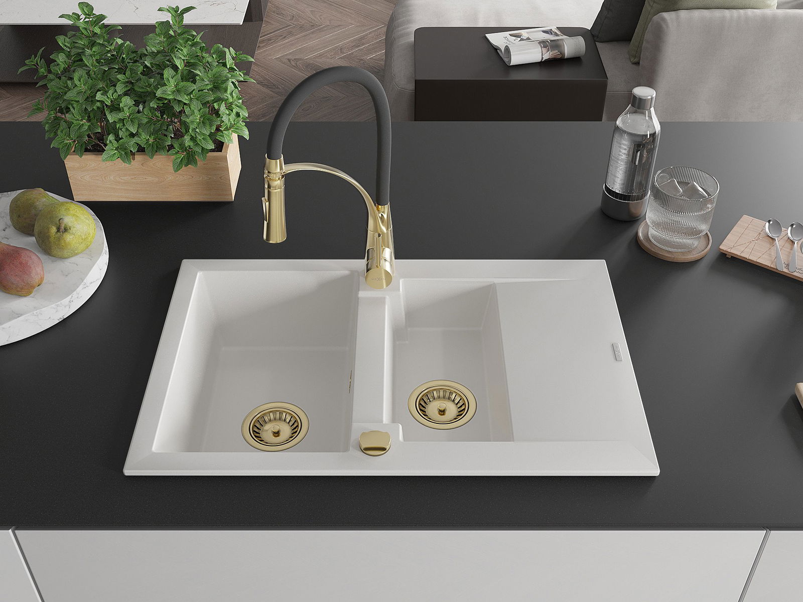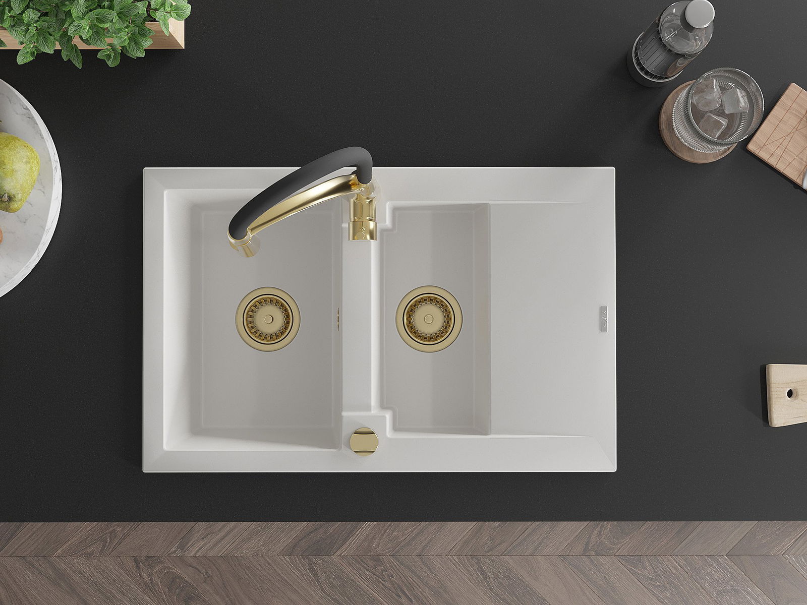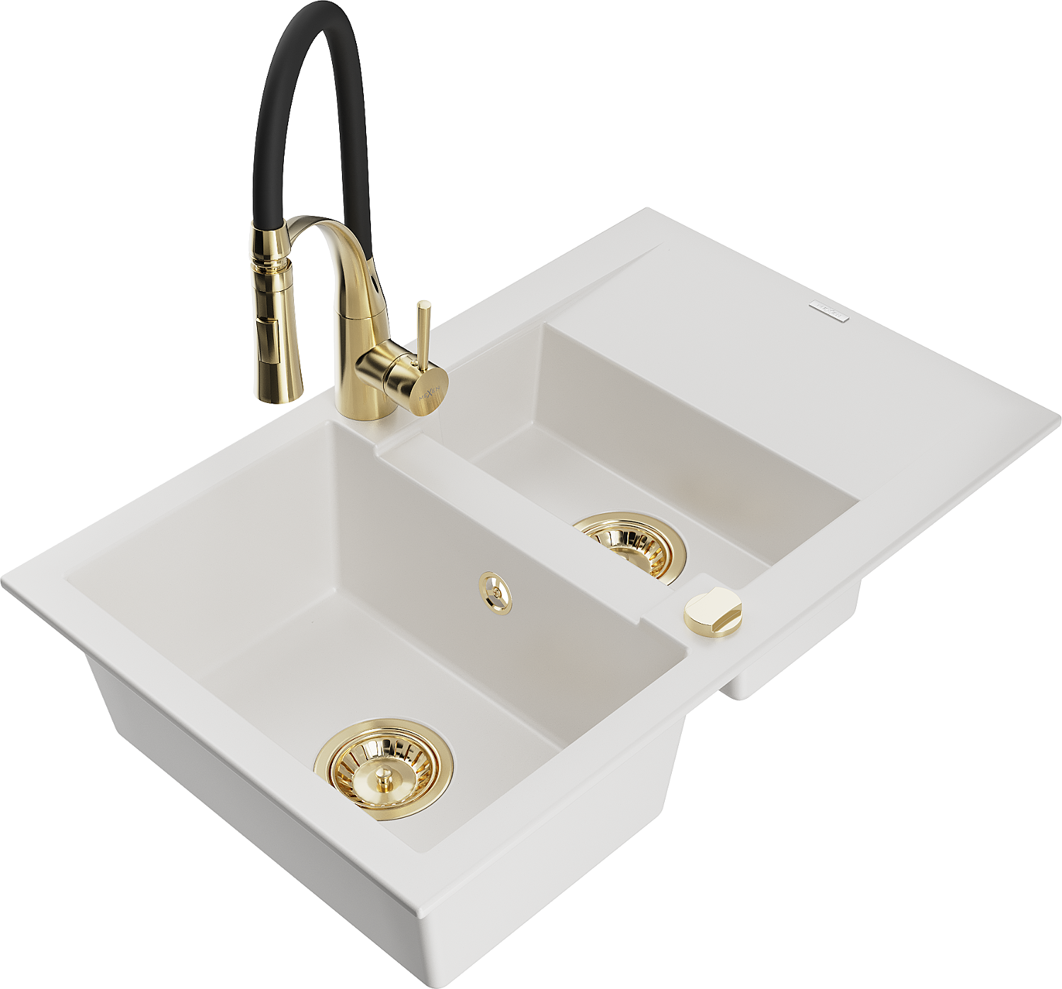 Mexen Gaspar zlewozmywak granitowy 1,5-komorowy z ociekaczem i baterią kuchenną Aster, biały - 6507-20-73450-57-G