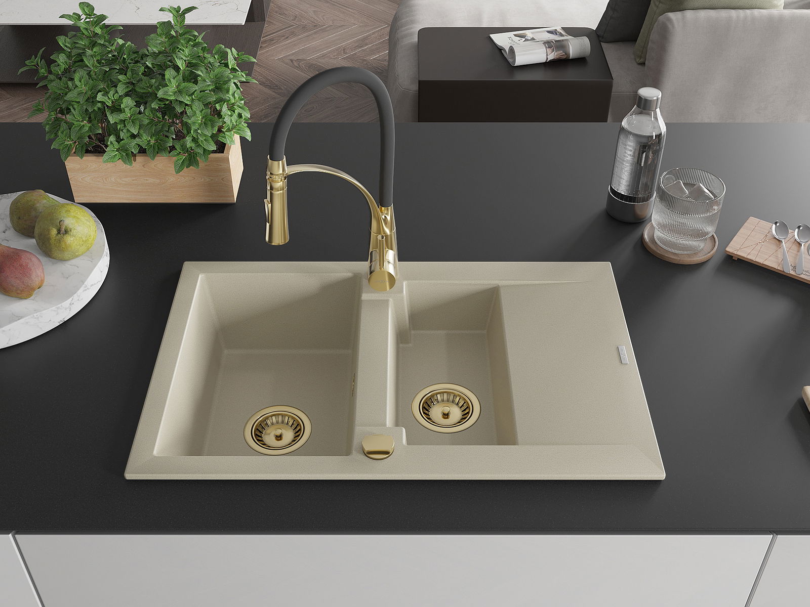 Mexen Gaspar zlewozmywak granitowy 1,5-komorowy z ociekaczem i baterią kuchenną Aster, beżowy - 6507-69-73450-57-G