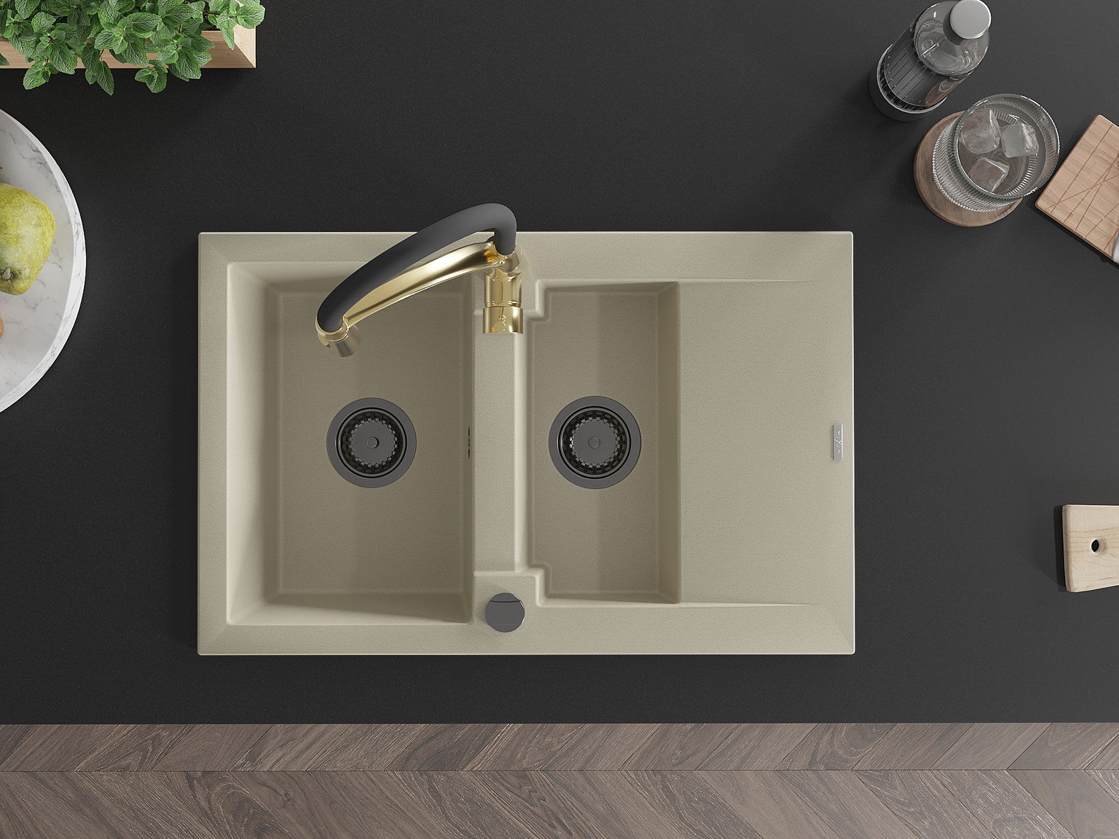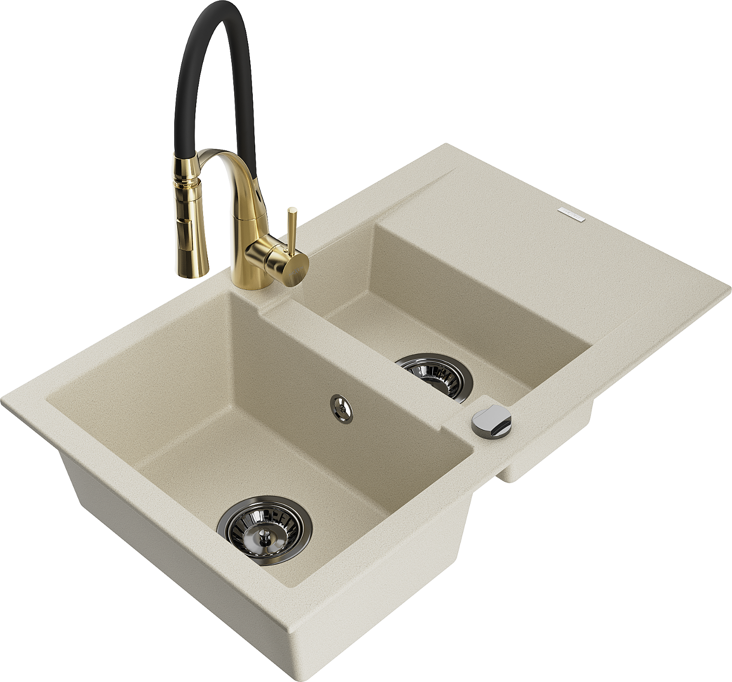 Mexen Gaspar zlewozmywak granitowy 1,5-komorowy z ociekaczem i baterią kuchenną Aster, beżowy - 6507-69-73450-57-B