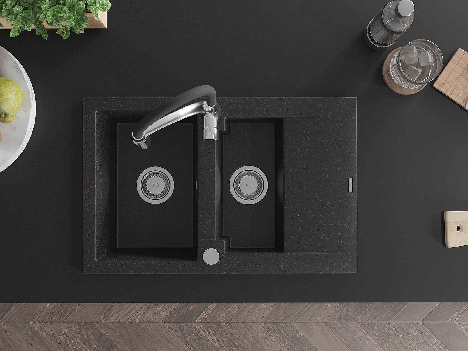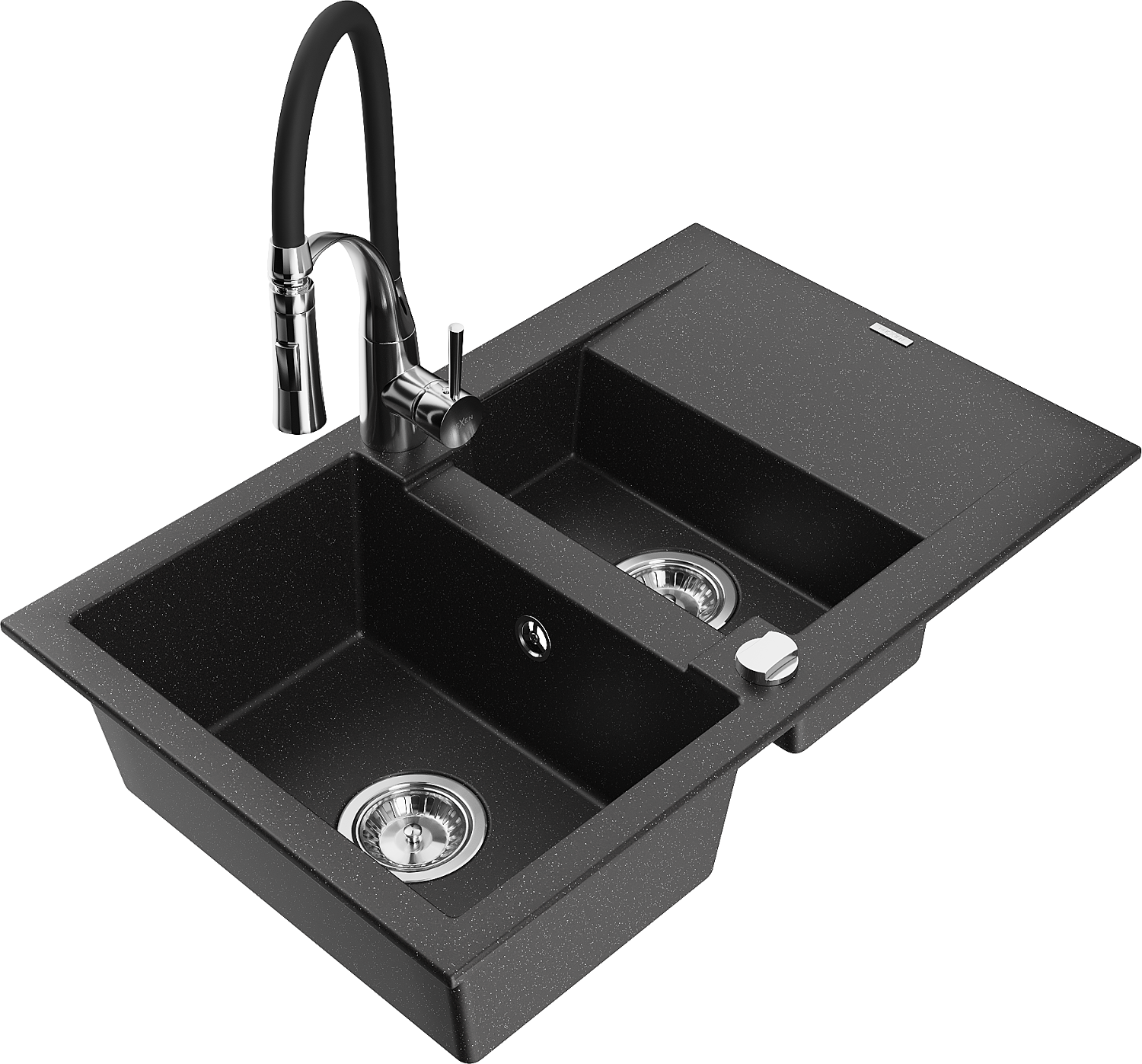 Mexen Gaspar zlewozmywak granitowy 1,5-komorowy z ociekaczem i baterią kuchenną Aster, czarny/srebrny metalik - 6507-73-73450-07