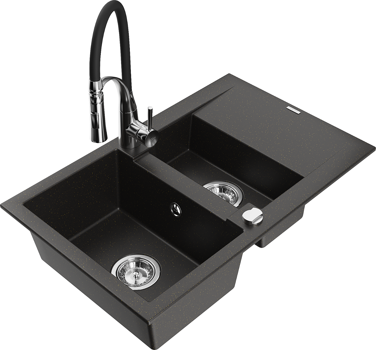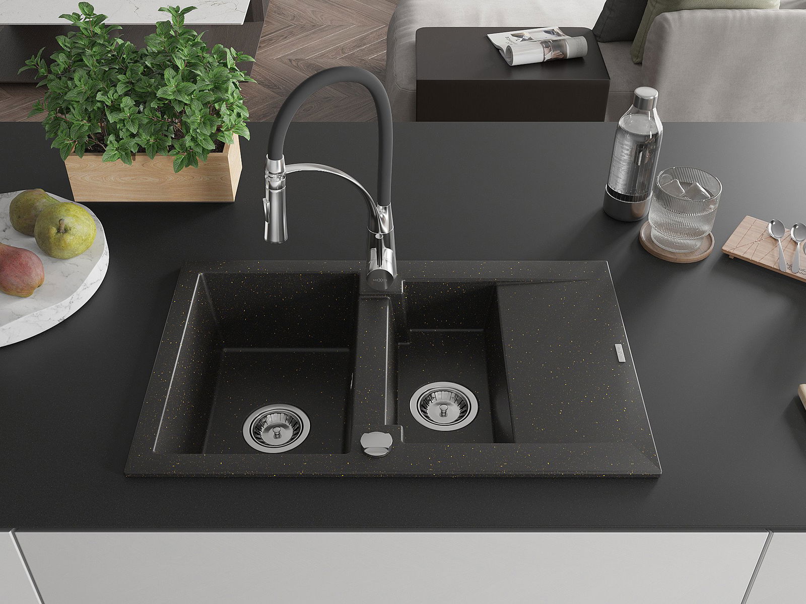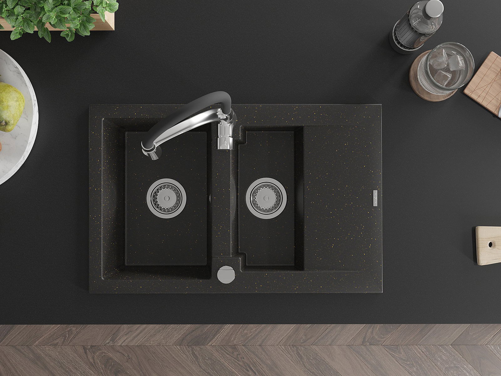 Mexen Gaspar zlewozmywak granitowy 1,5-komorowy z ociekaczem i baterią kuchenną Aster, czarny/złoty metalik - 6507-75-73450-07