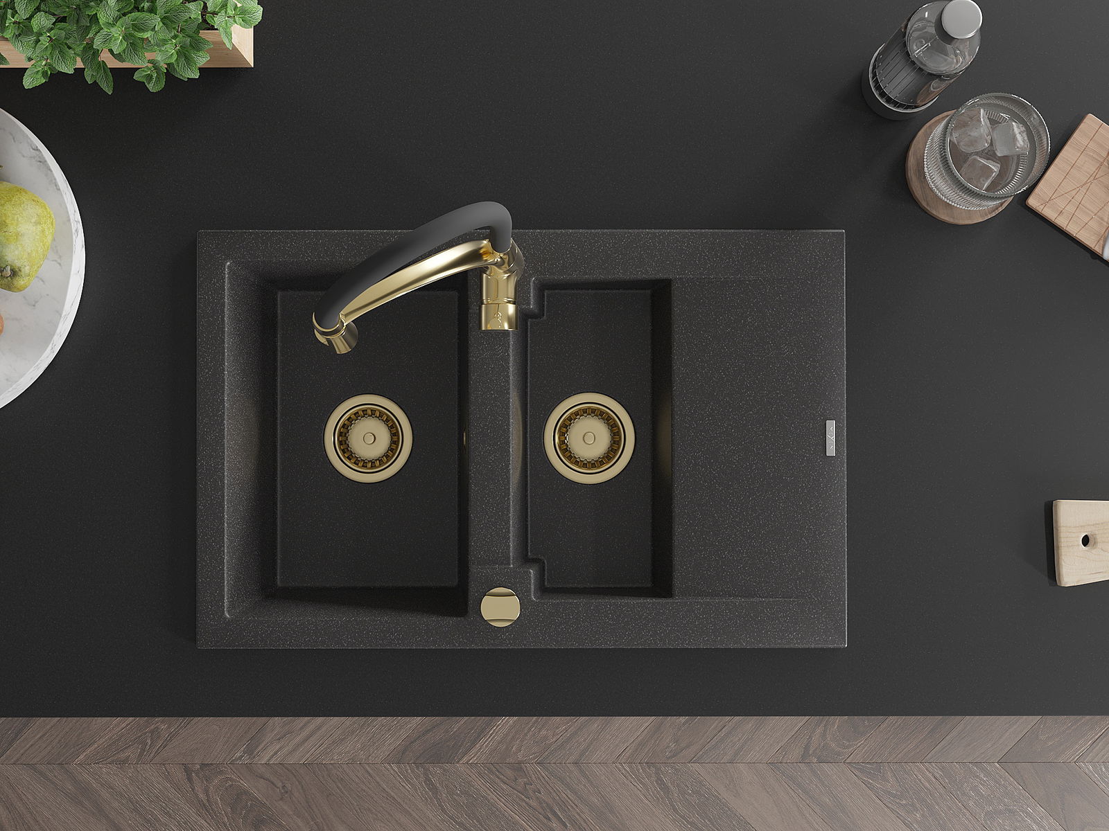 Mexen Gaspar zlewozmywak granitowy 1,5-komorowy z ociekaczem i baterią kuchenną Aster, czarny nakrapiany - 6507-76-73450-57-G