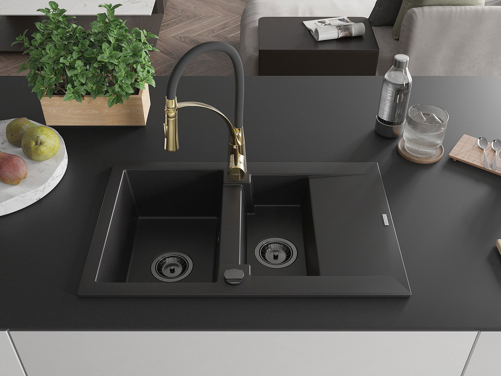 Mexen Gaspar zlewozmywak granitowy 1,5-komorowy z ociekaczem i baterią kuchenną Aster, czarny - 6507-77-73450-57-B