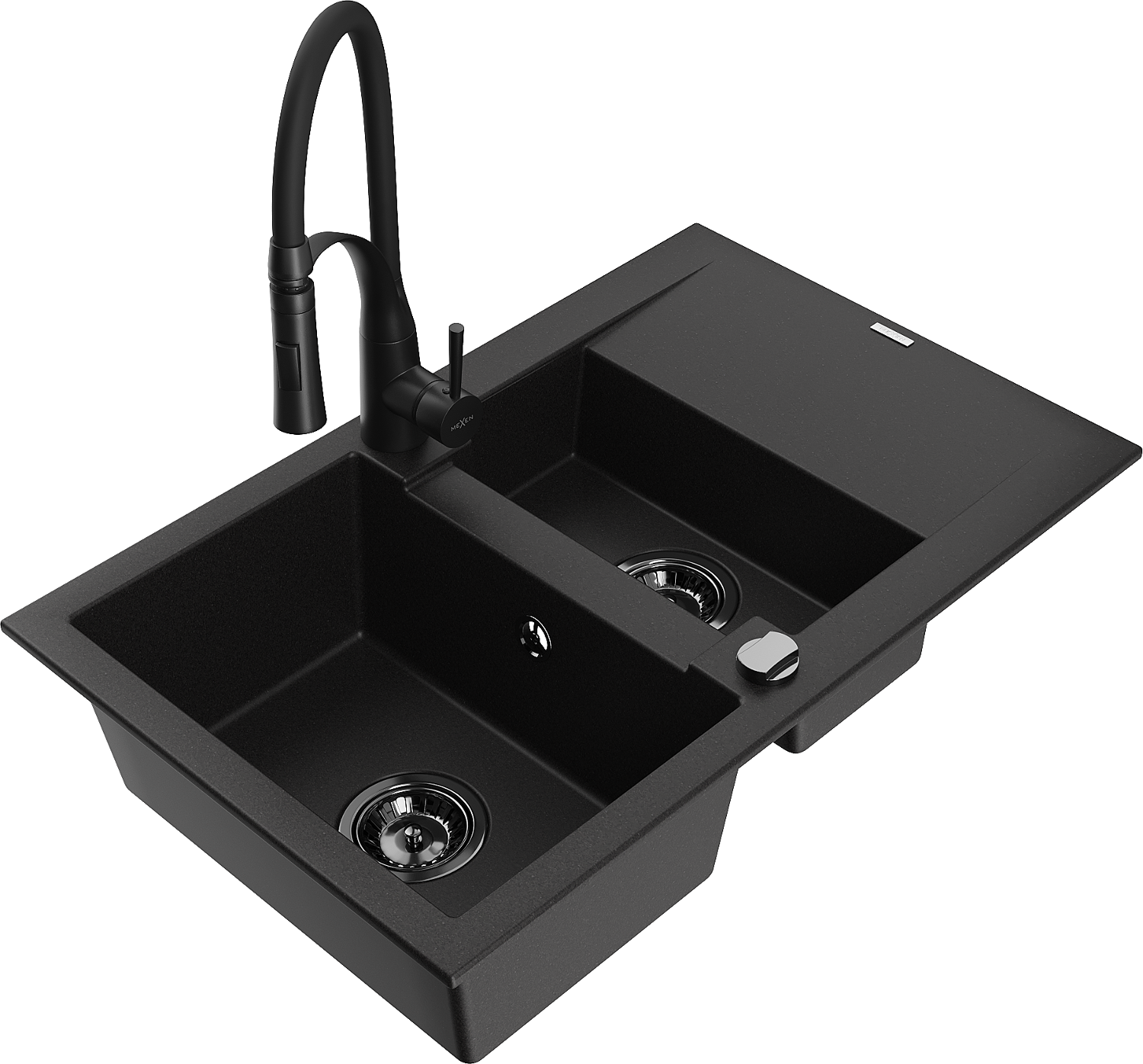Mexen Gaspar zlewozmywak granitowy 1,5-komorowy z ociekaczem i baterią kuchenną Aster, czarny - 6507-77-73450-70-B