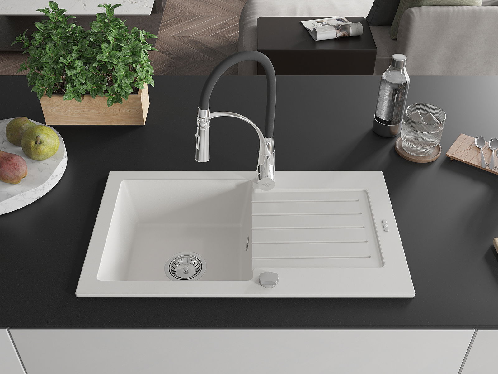 Mexen Pablo zlewozmywak granitowy 1-komorowy z ociekaczem i baterią kuchenną Aster, biały - 6510-20-73450-07