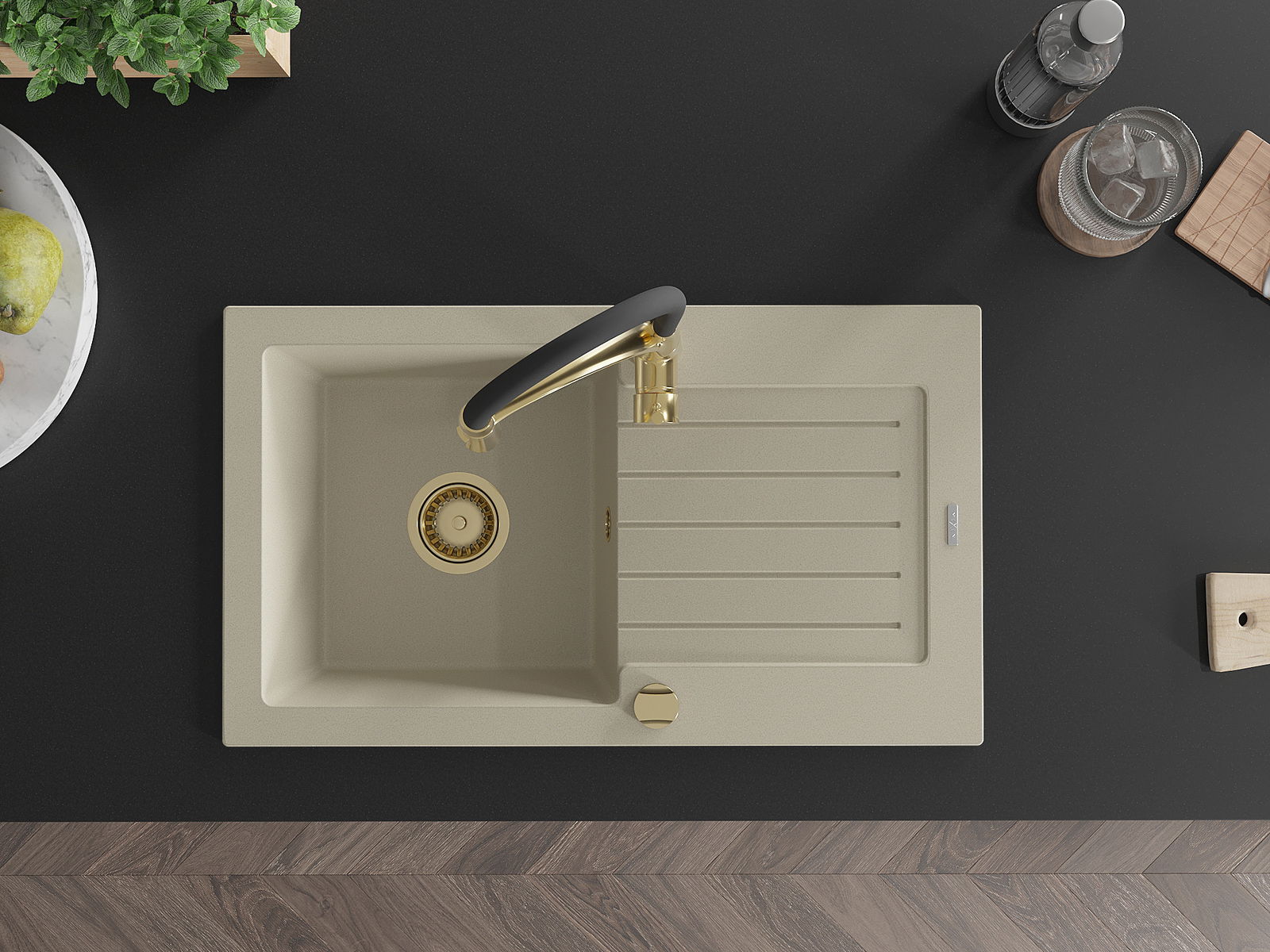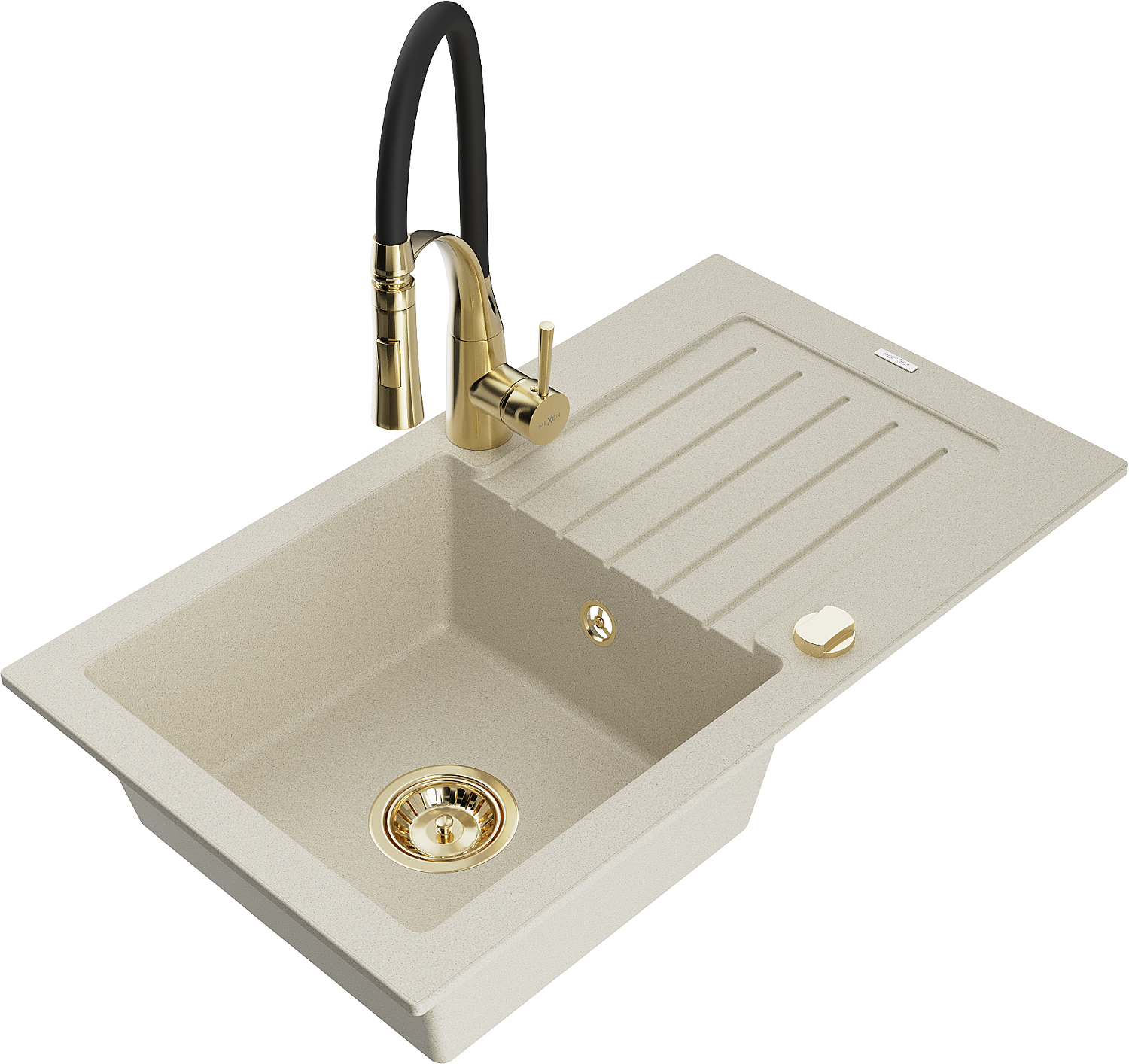 Mexen Pablo zlewozmywak granitowy 1-komorowy z ociekaczem i baterią kuchenną Aster, beżowy - 6510-69-73450-57-G