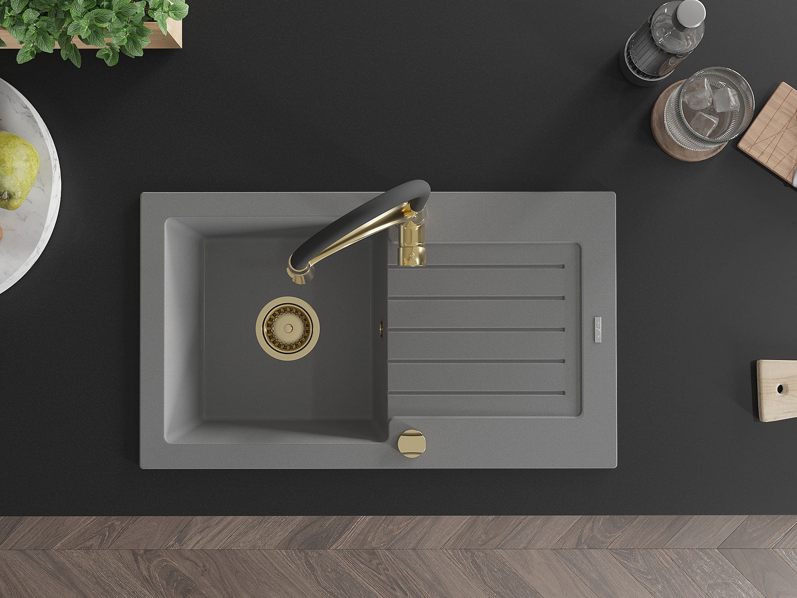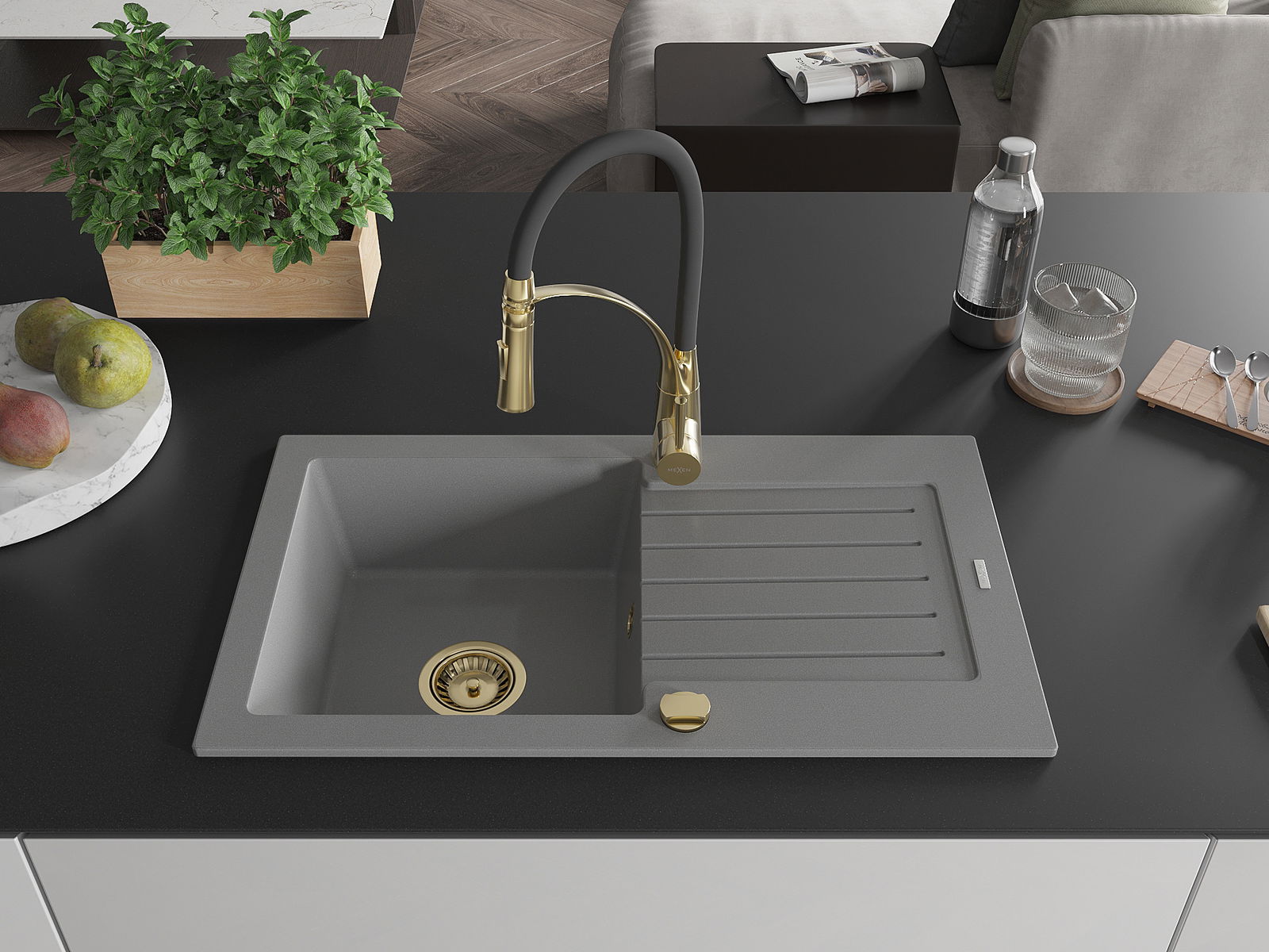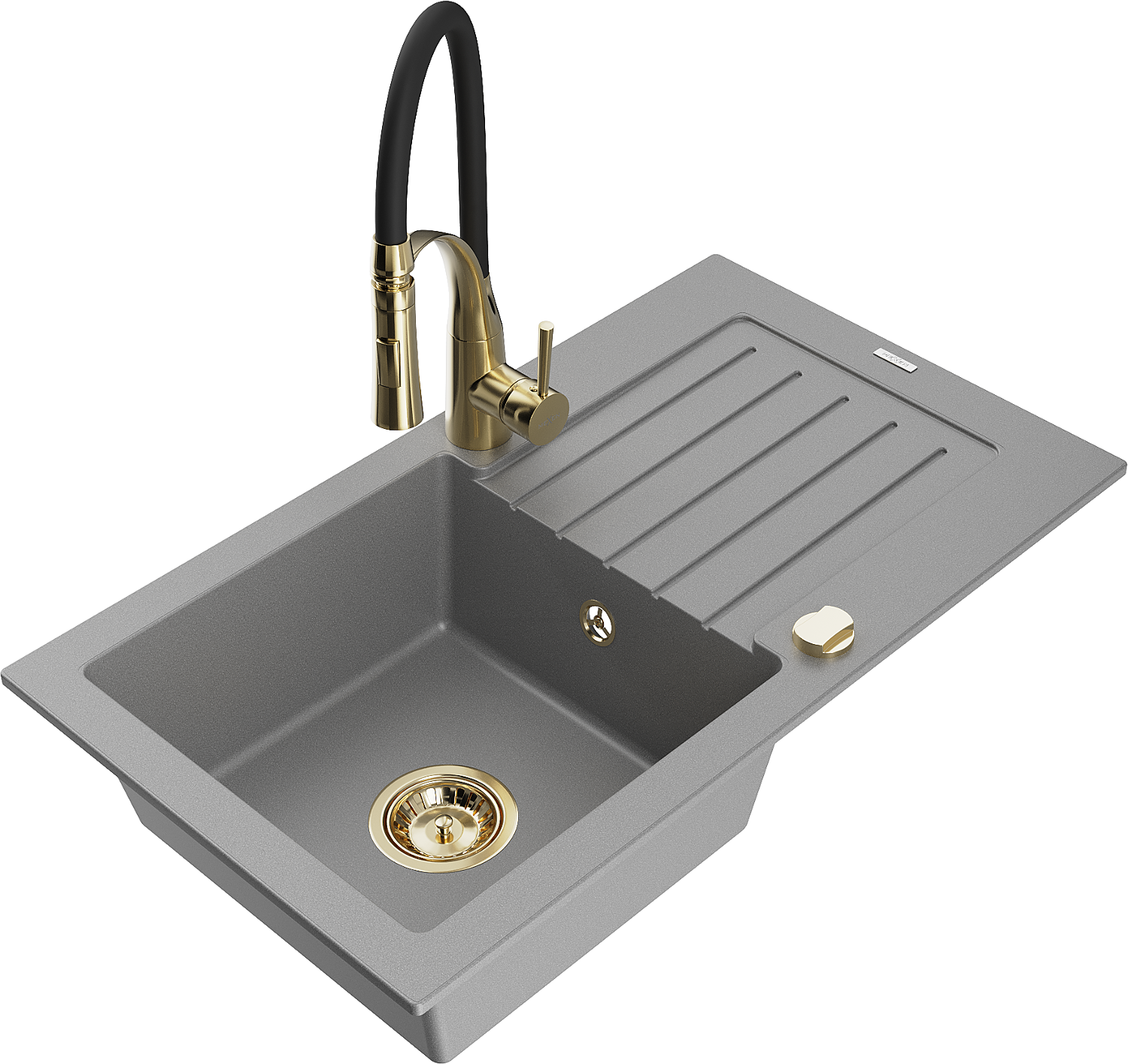 Mexen Pablo zlewozmywak granitowy 1-komorowy z ociekaczem i baterią kuchenną Aster, szary - 6510-71-73450-57-G
