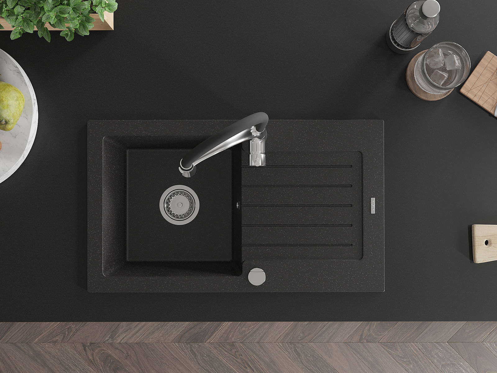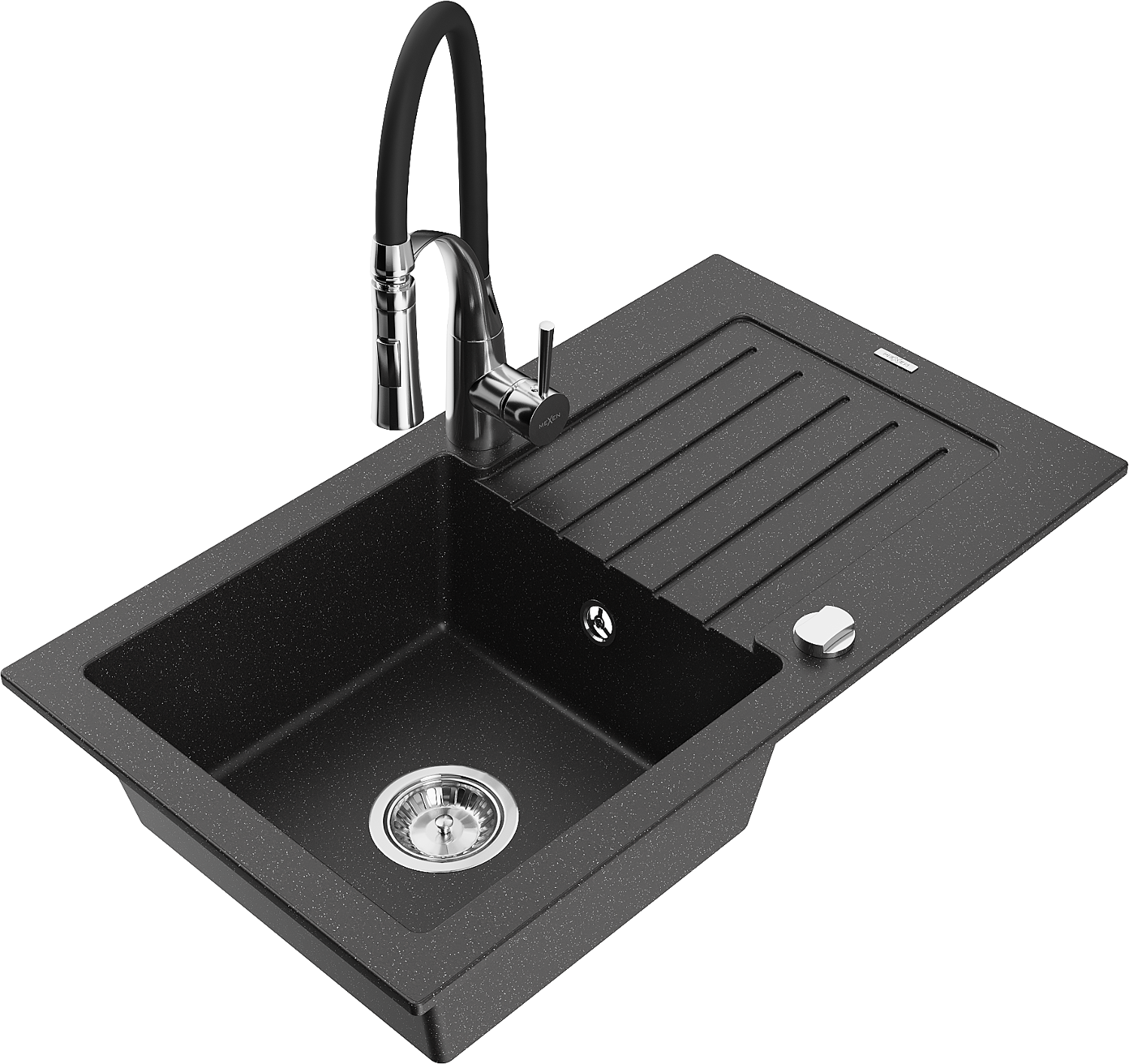 Mexen Pablo zlewozmywak granitowy 1-komorowy z ociekaczem i baterią kuchenną Aster, czarny/srebrny metalik - 6510-73-73450-07