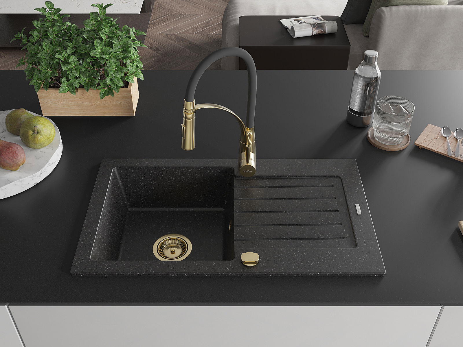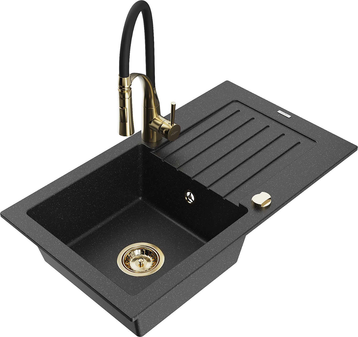 Mexen Pablo zlewozmywak granitowy 1-komorowy z ociekaczem i baterią kuchenną Aster, czarny/srebrny metalik - 6510-73-73450-57-G