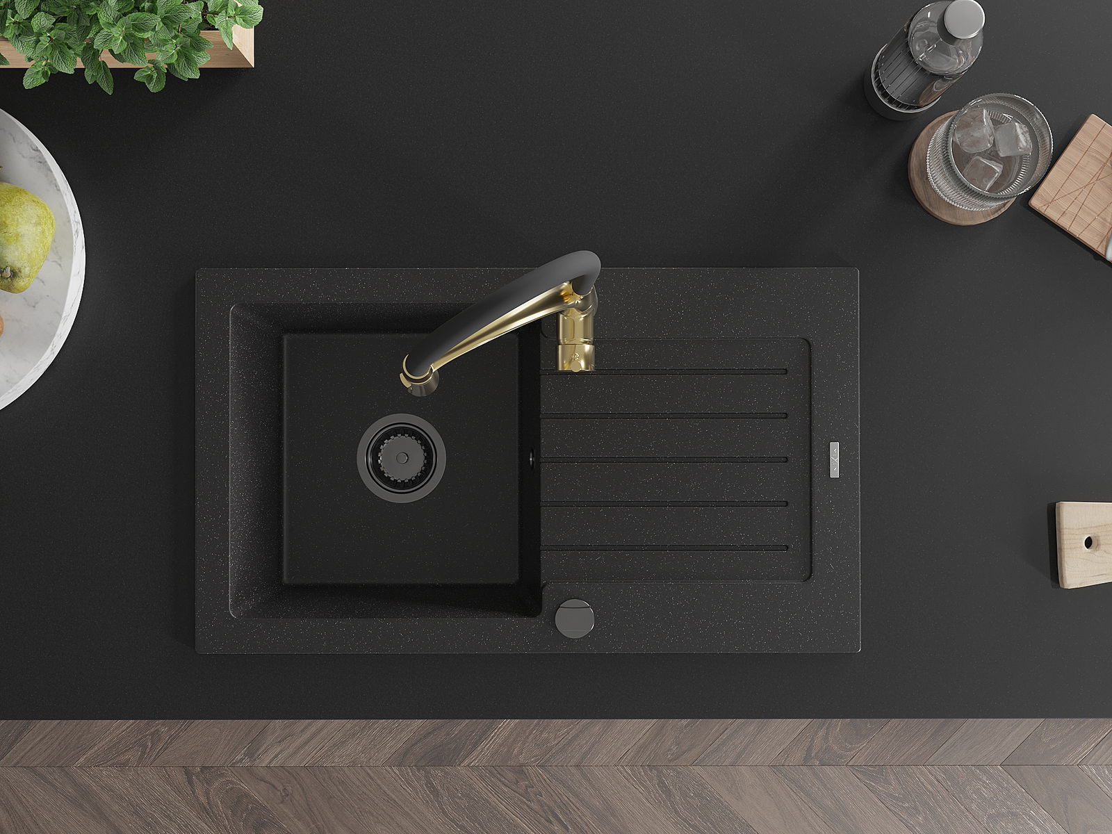 Mexen Pablo zlewozmywak granitowy 1-komorowy z ociekaczem i baterią kuchenną Aster, czarny/srebrny metalik - 6510-73-73450-57-B