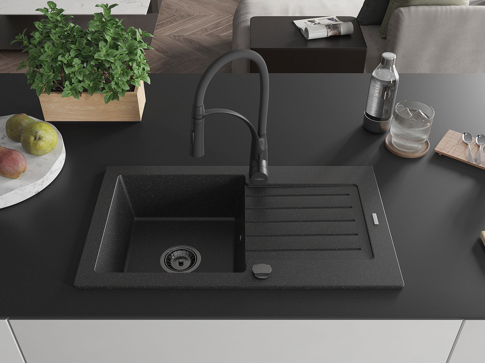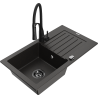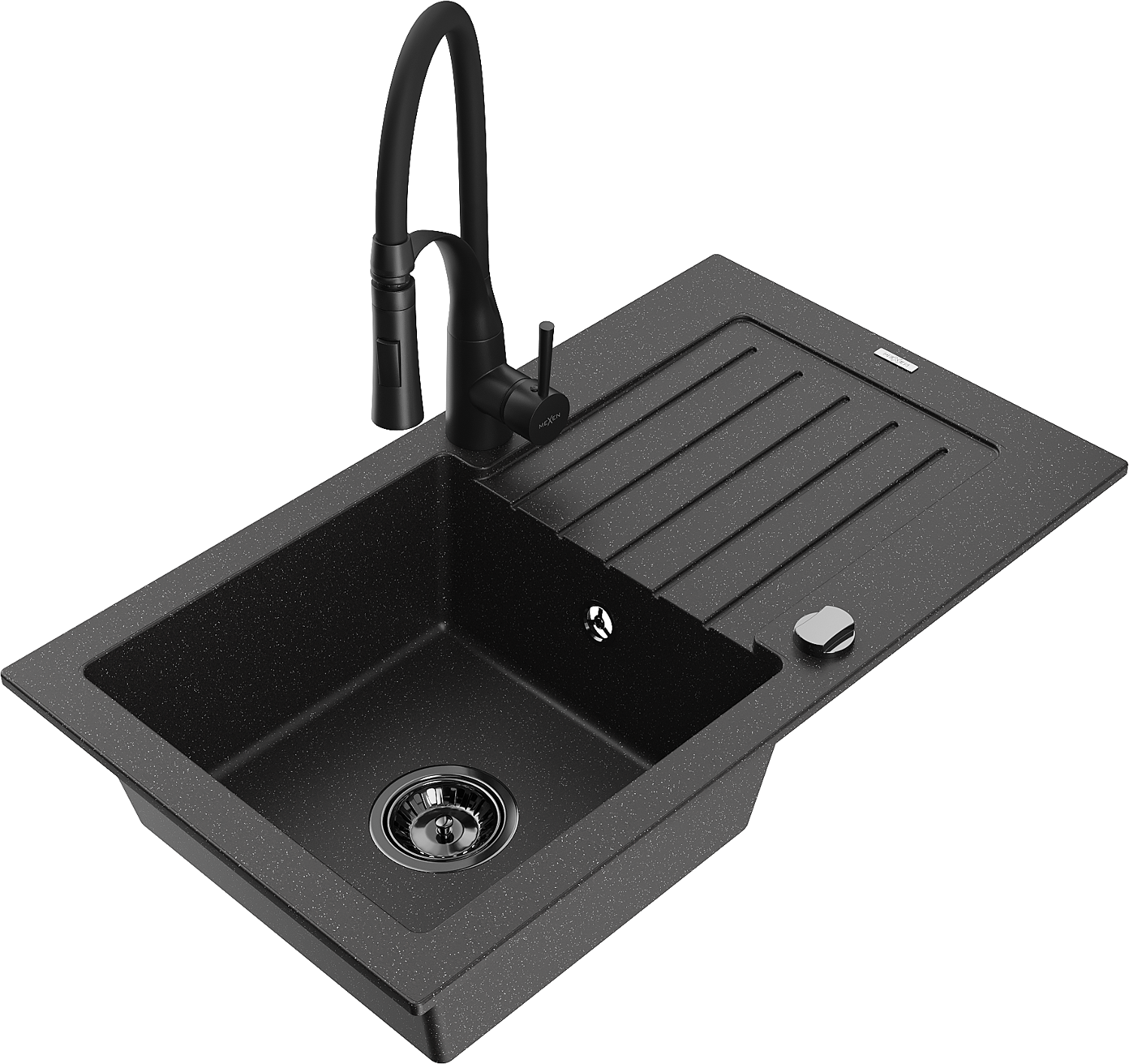 Mexen Pablo zlewozmywak granitowy 1-komorowy z ociekaczem i baterią kuchenną Aster, czarny/srebrny metalik - 6510-73-73450-70-B