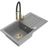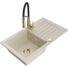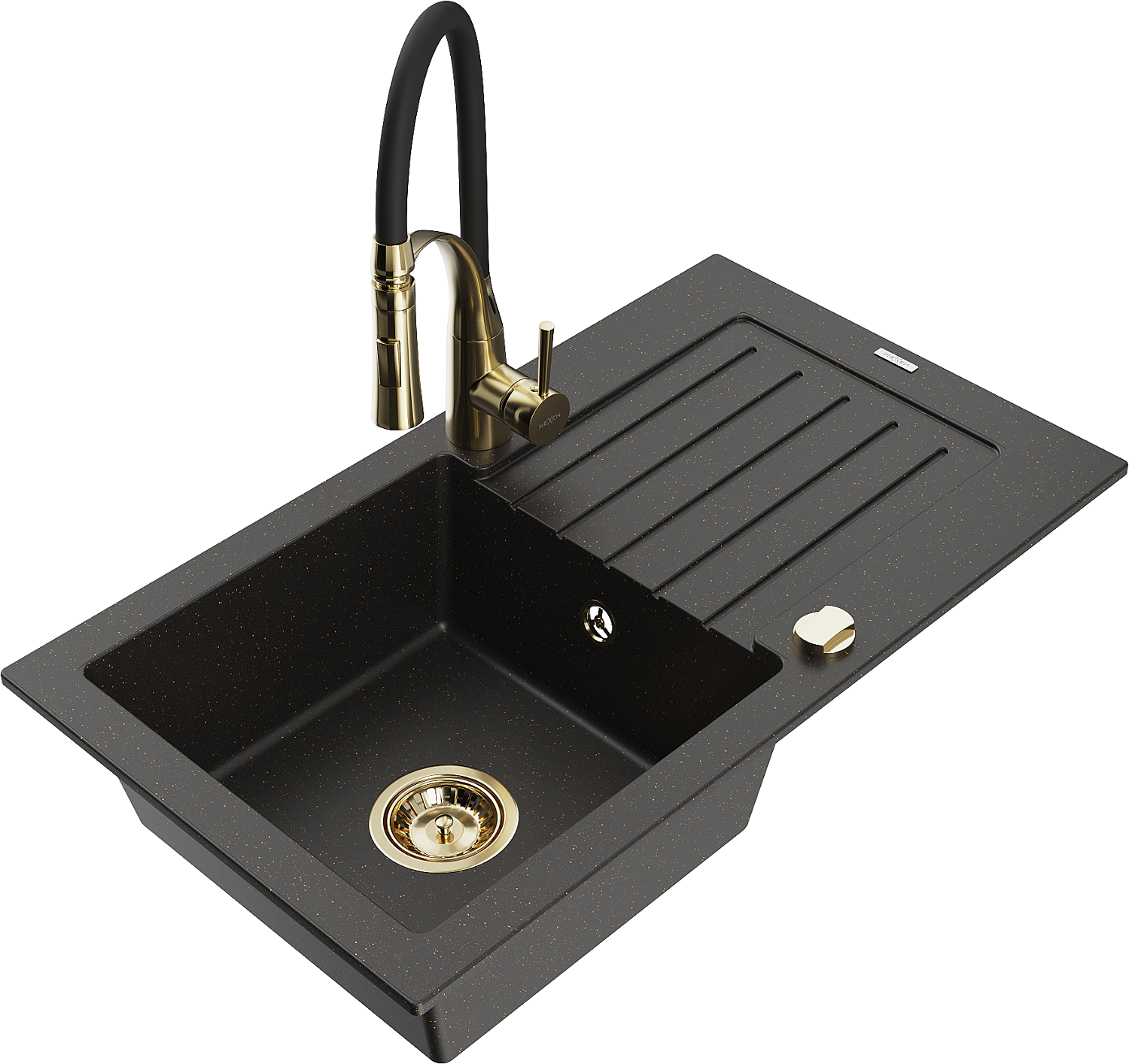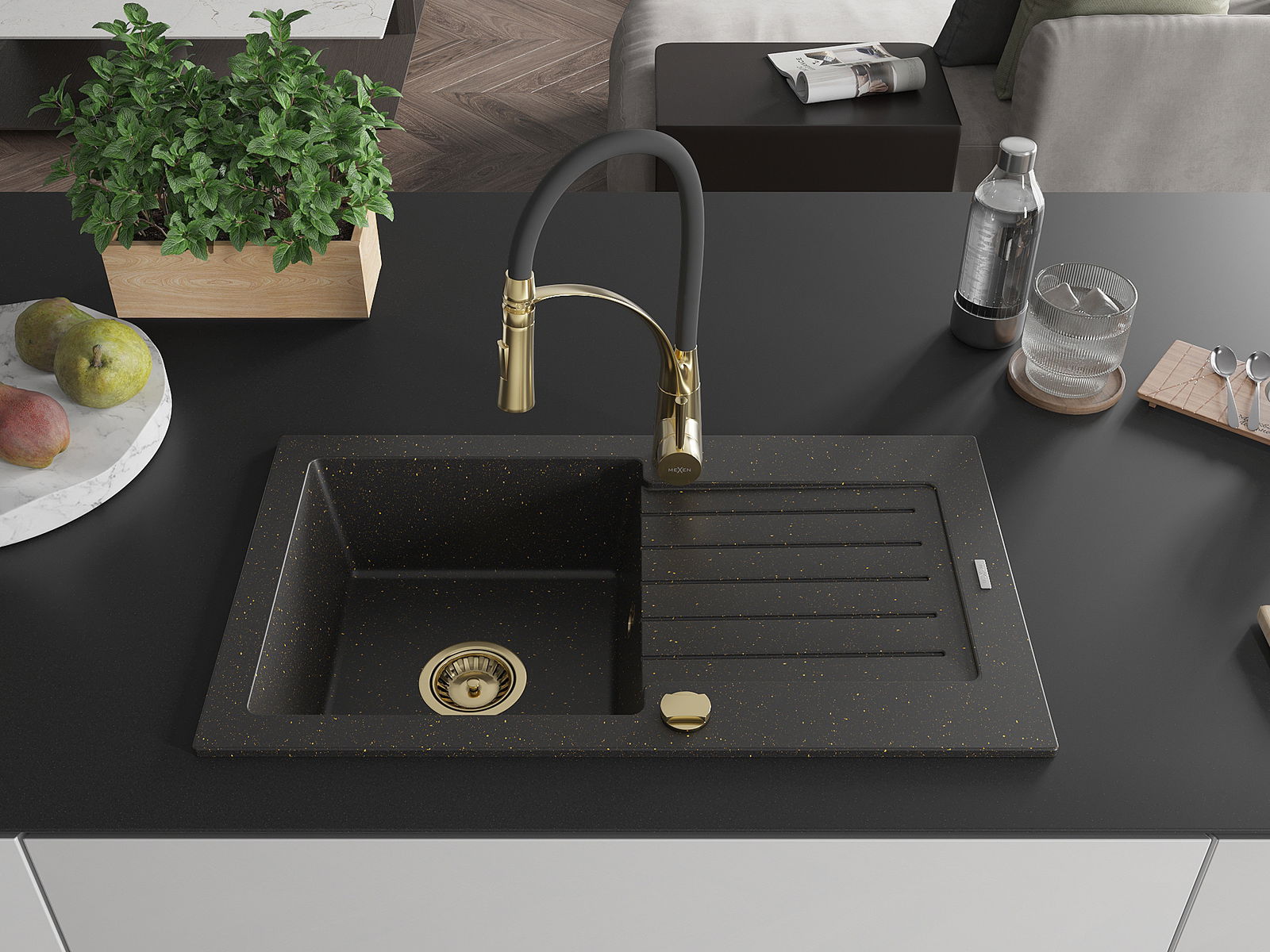 Mexen Pablo zlewozmywak granitowy 1-komorowy z ociekaczem i baterią kuchenną Aster, czarny/złoty metalik - 6510-75-73450-57-G