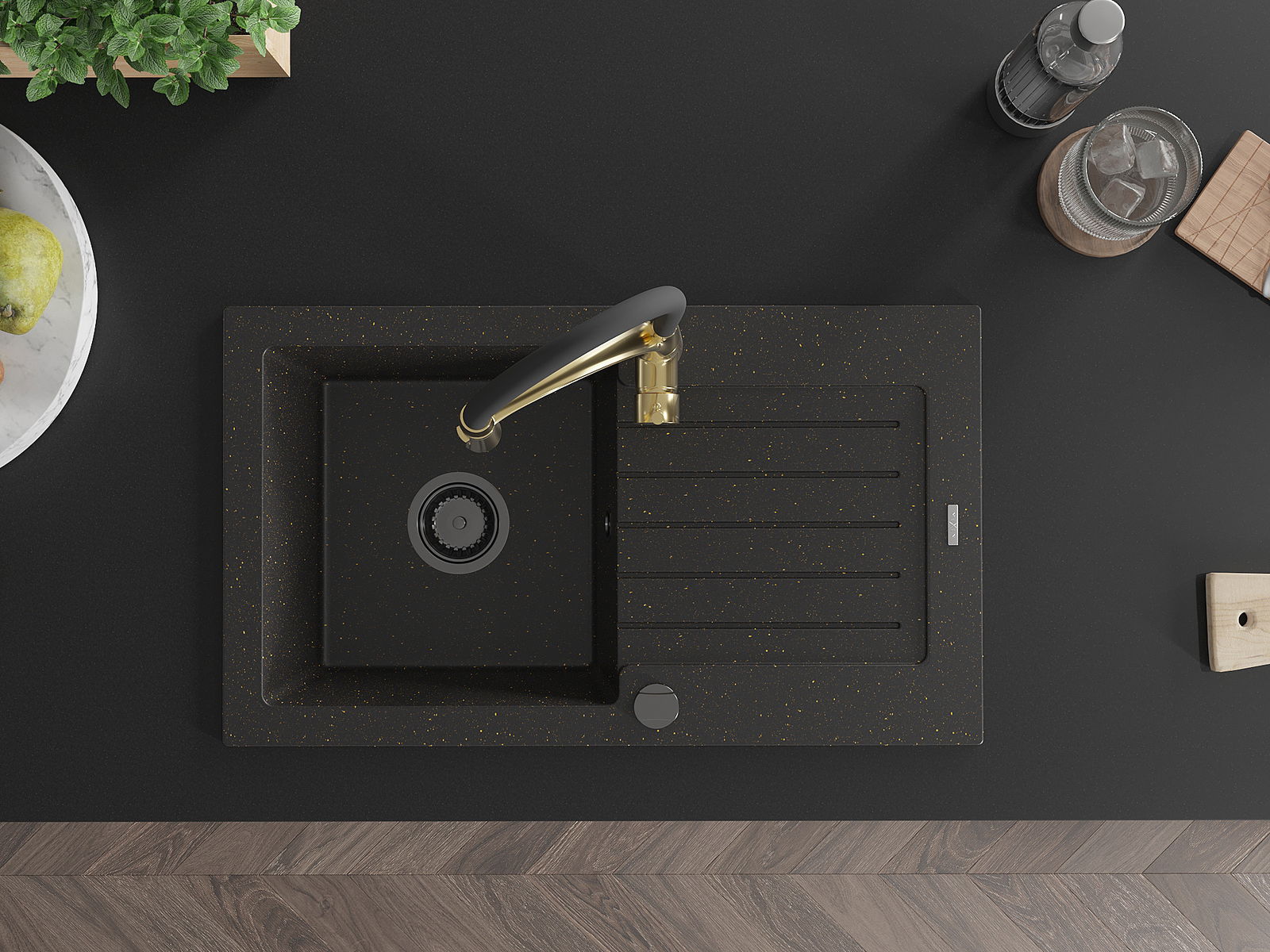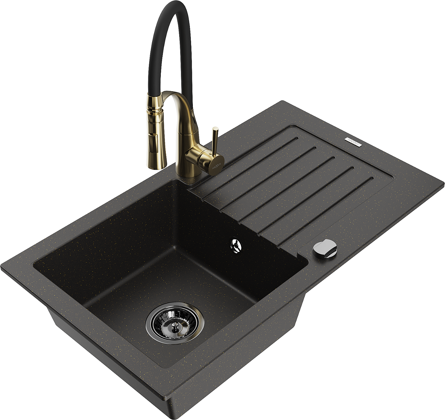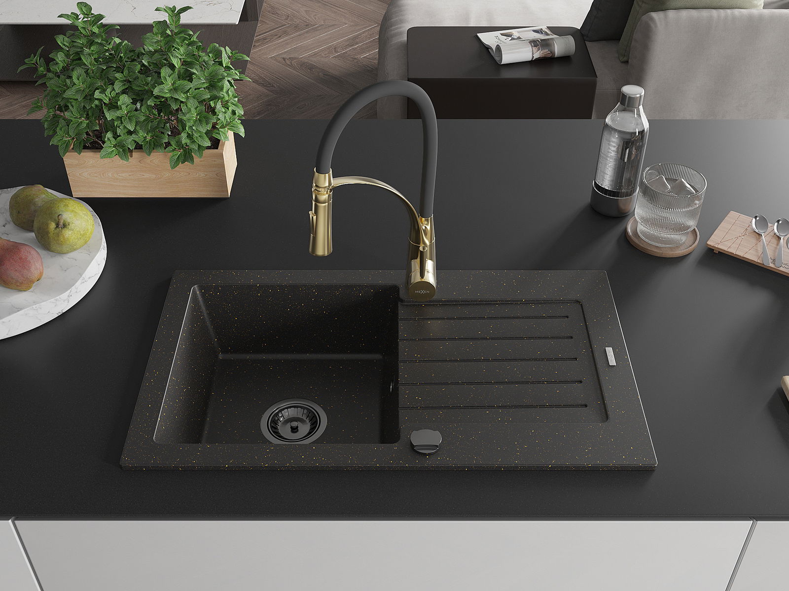Mexen Pablo zlewozmywak granitowy 1-komorowy z ociekaczem i baterią kuchenną Aster, czarny/złoty metalik - 6510-75-73450-57-B