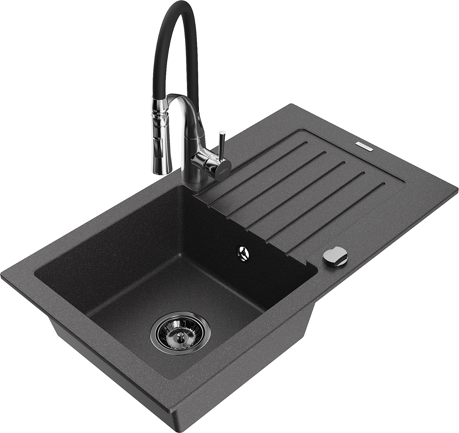 Mexen Pablo zlewozmywak granitowy 1-komorowy z ociekaczem i baterią kuchenną Aster, czarny nakrapiany - 6510-76-73450-07-B