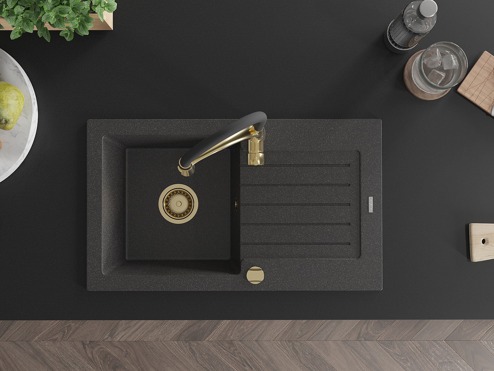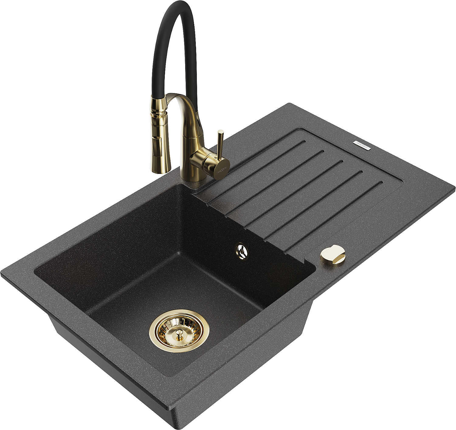 Mexen Pablo zlewozmywak granitowy 1-komorowy z ociekaczem i baterią kuchenną Aster, czarny nakrapiany - 6510-76-73450-57-G