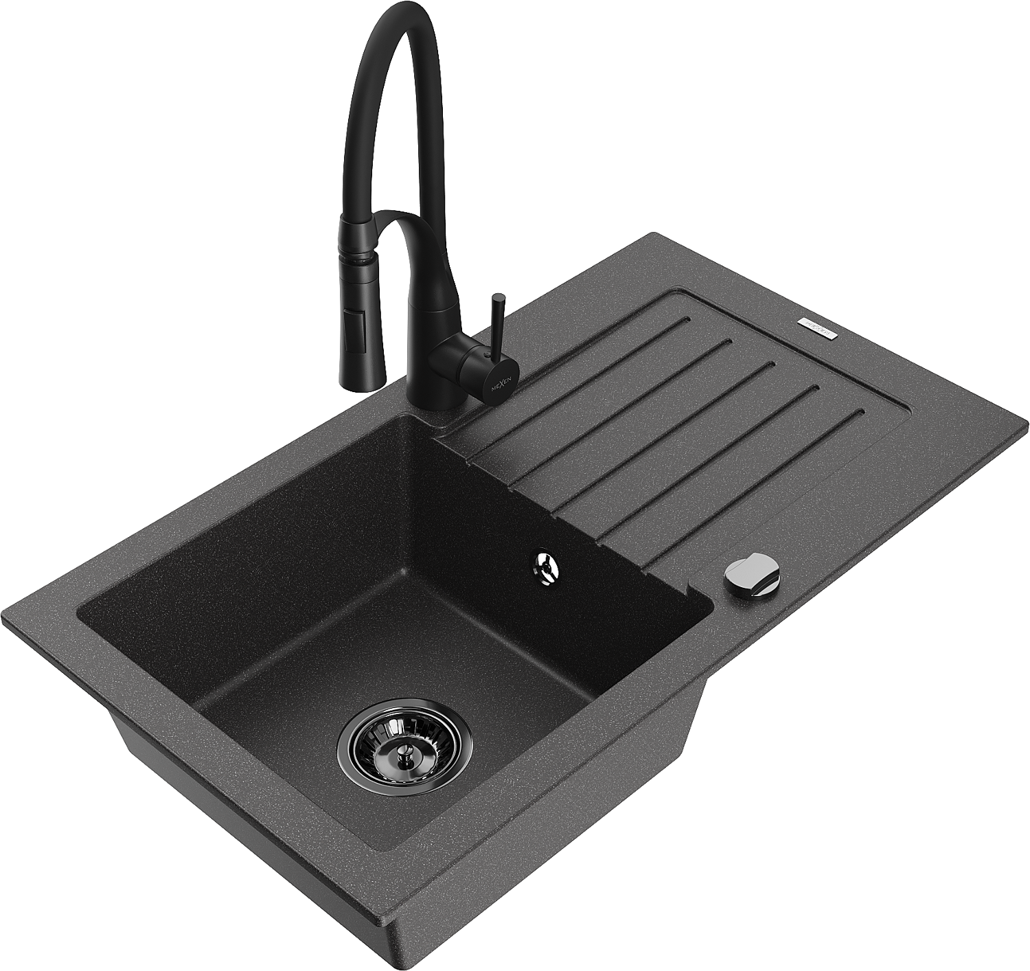 Mexen Pablo zlewozmywak granitowy 1-komorowy z ociekaczem i baterią kuchenną Aster, czarny nakrapiany - 6510-76-73450-70-B