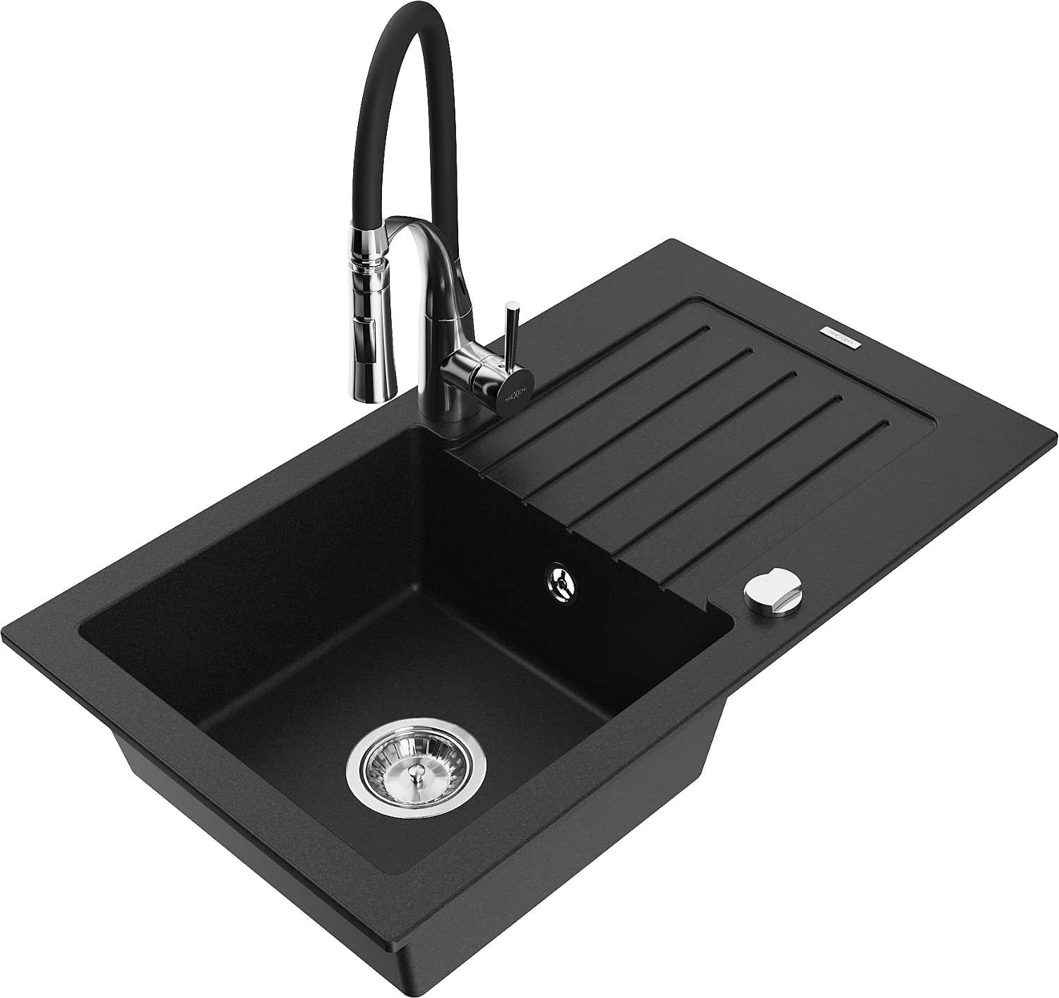 Mexen Pablo zlewozmywak granitowy 1-komorowy z ociekaczem i baterią kuchenną Aster, czarny - 6510-77-73450-07