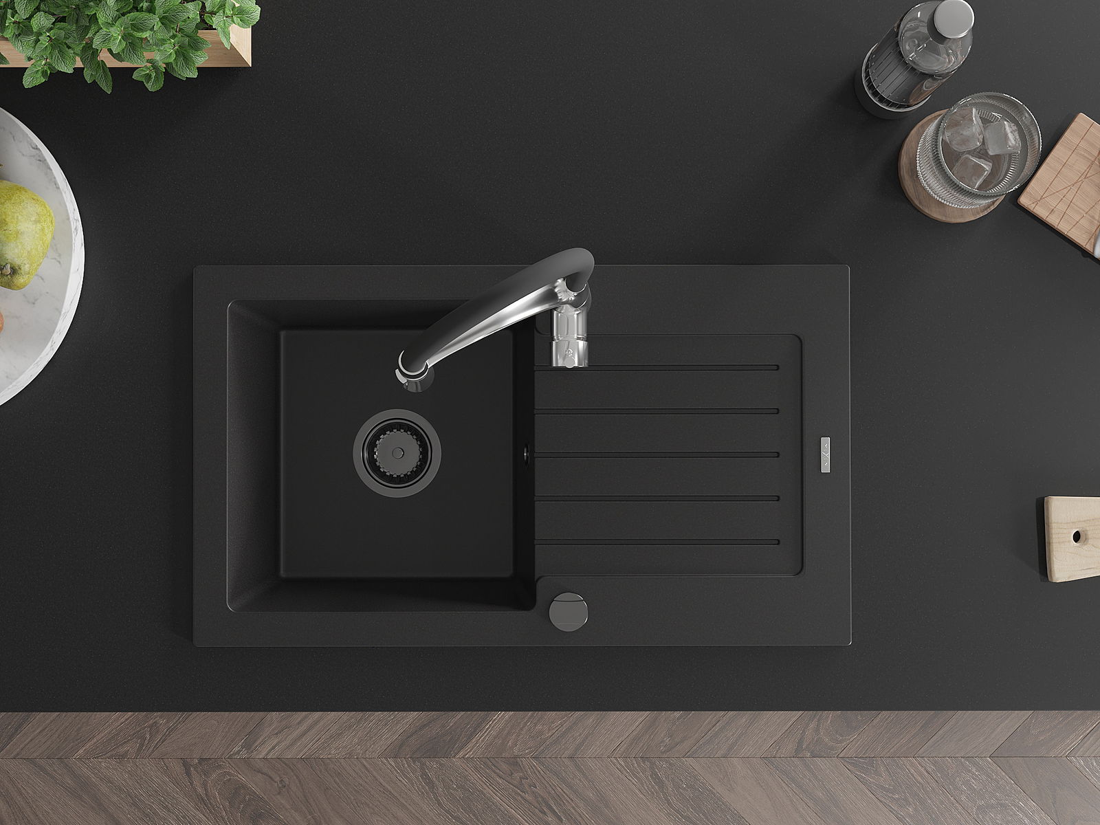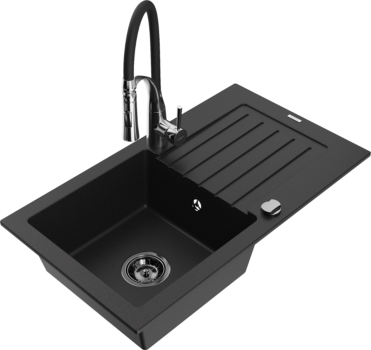 Mexen Pablo zlewozmywak granitowy 1-komorowy z ociekaczem i baterią kuchenną Aster, czarny - 6510-77-73450-07-B