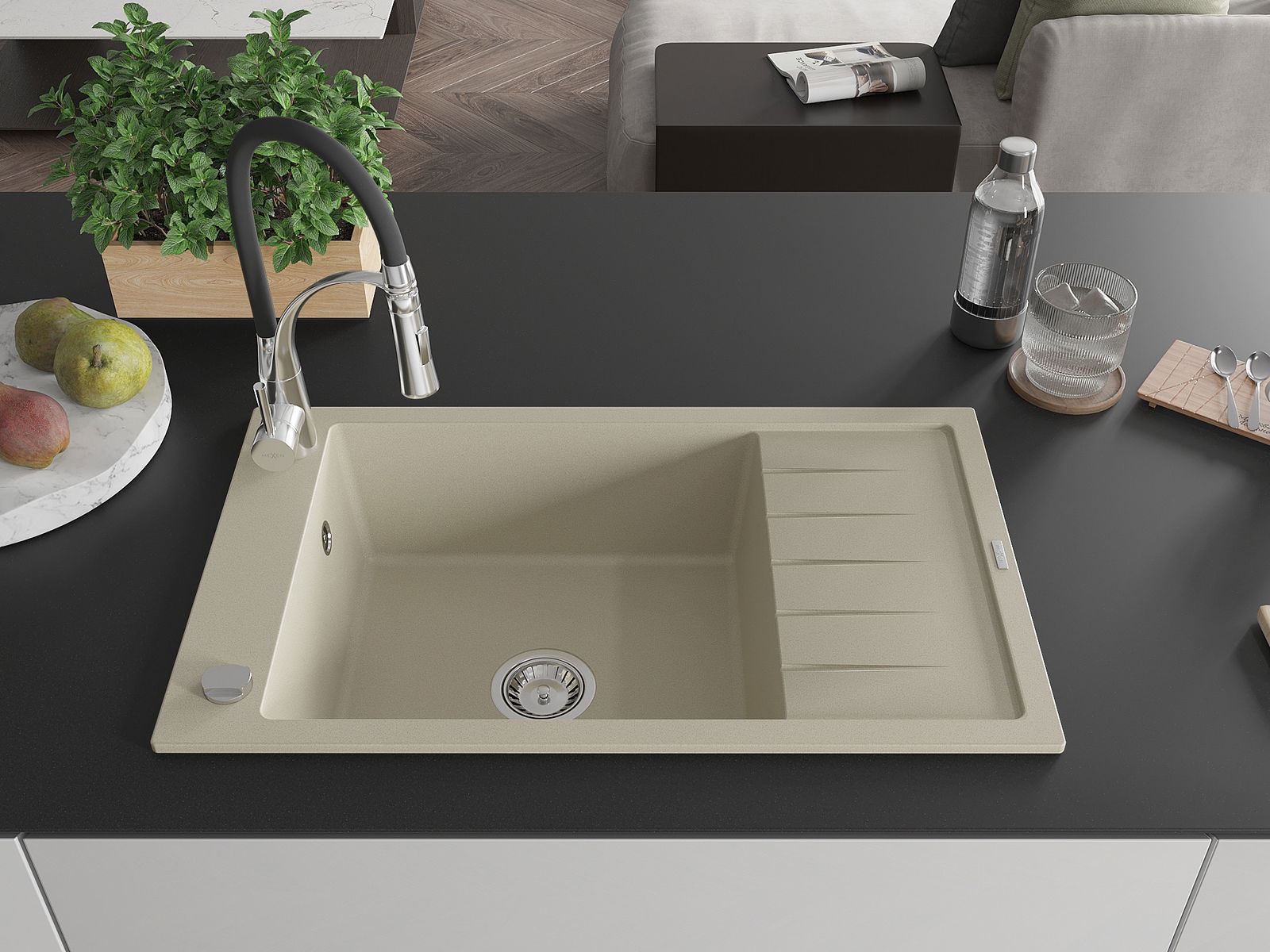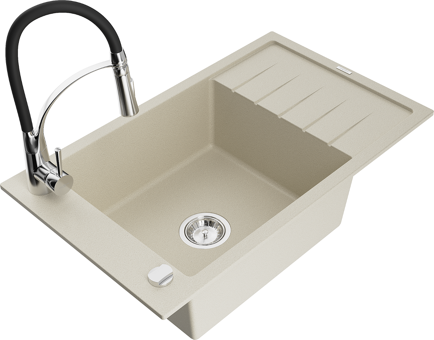Mexen Elias zlewozmywak granitowy 1-komorowy z ociekaczem i baterią kuchenną Aster, beżowy - 6511-69-73450-07