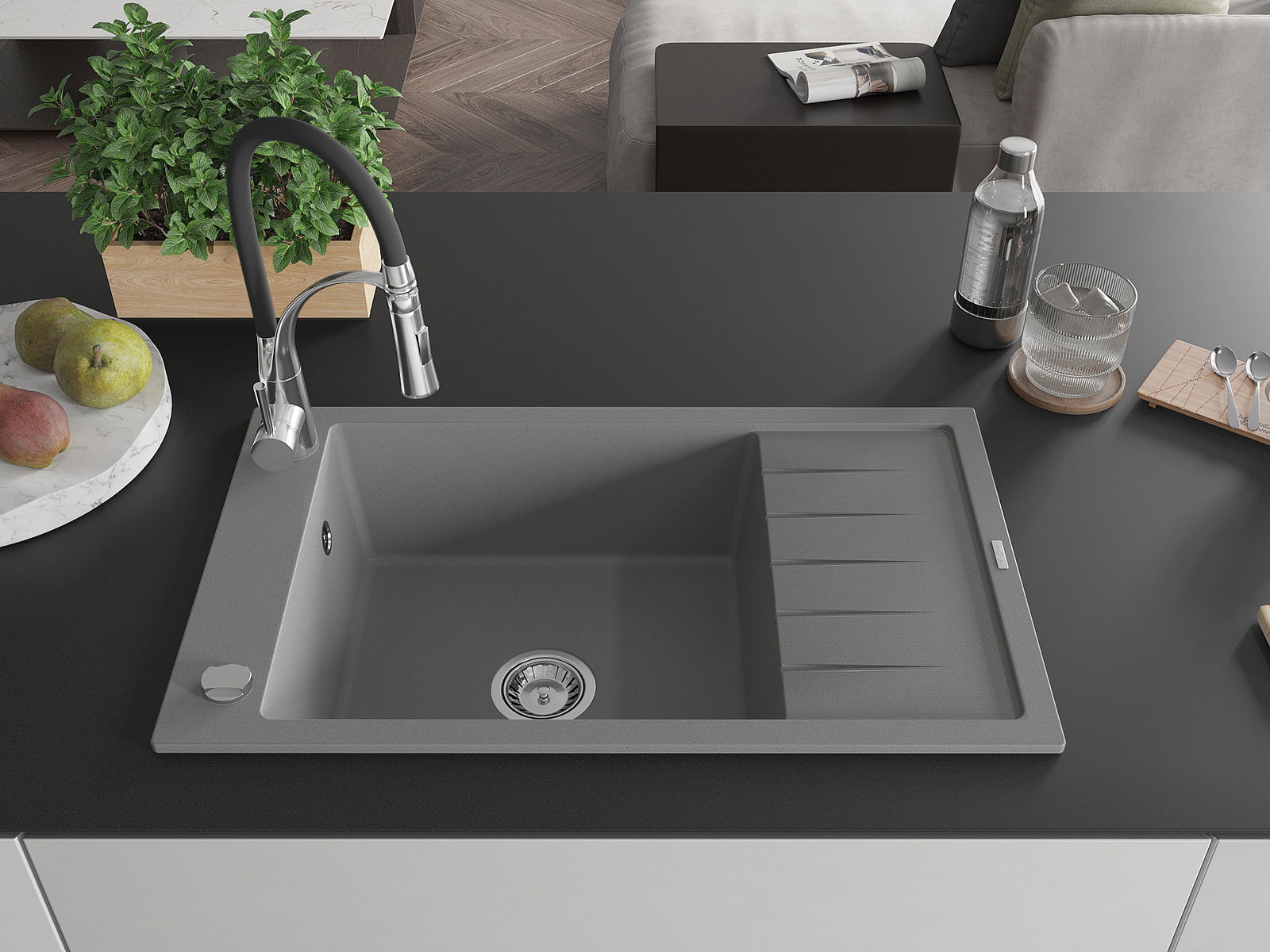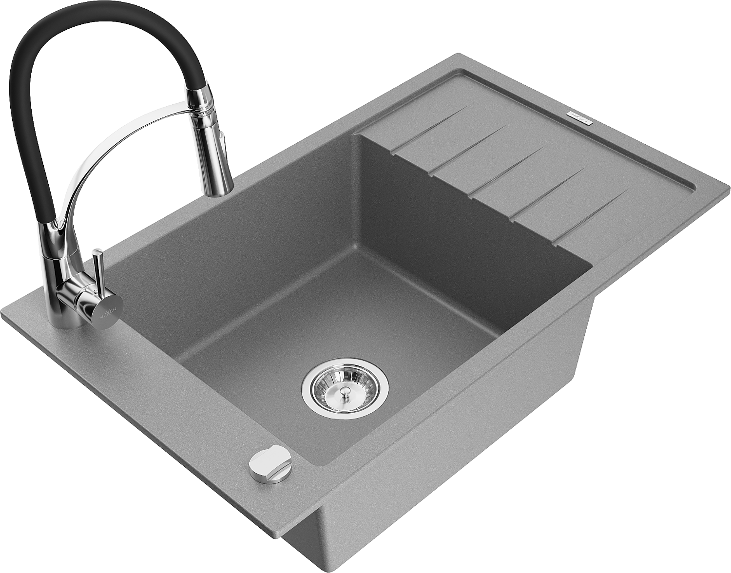 Mexen Elias zlewozmywak granitowy 1-komorowy z ociekaczem i baterią kuchenną Aster, szary - 6511-71-73450-07