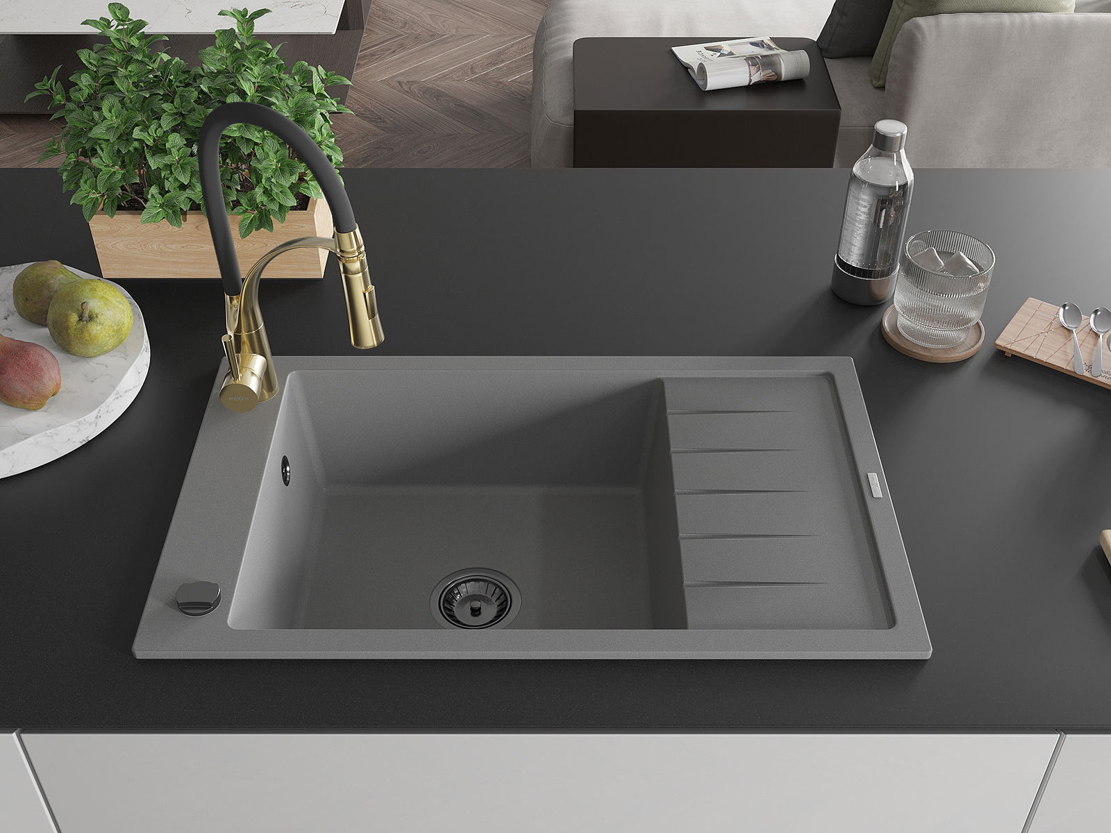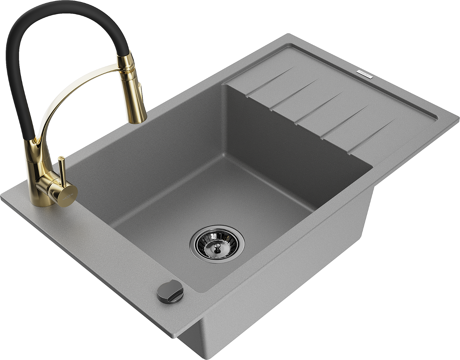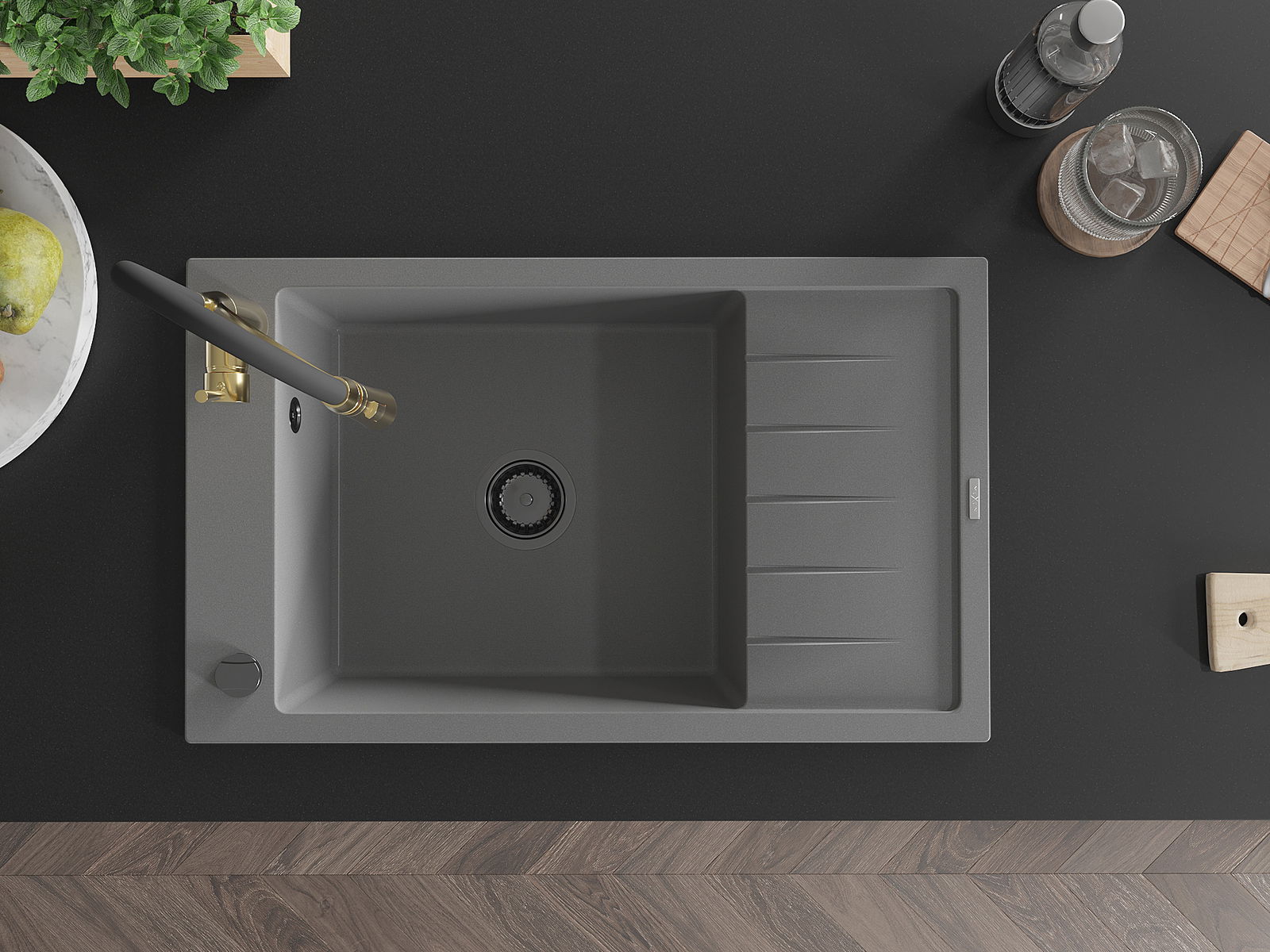 Mexen Elias zlewozmywak granitowy 1-komorowy z ociekaczem i baterią kuchenną Aster, szary - 6511-71-73450-57-B
