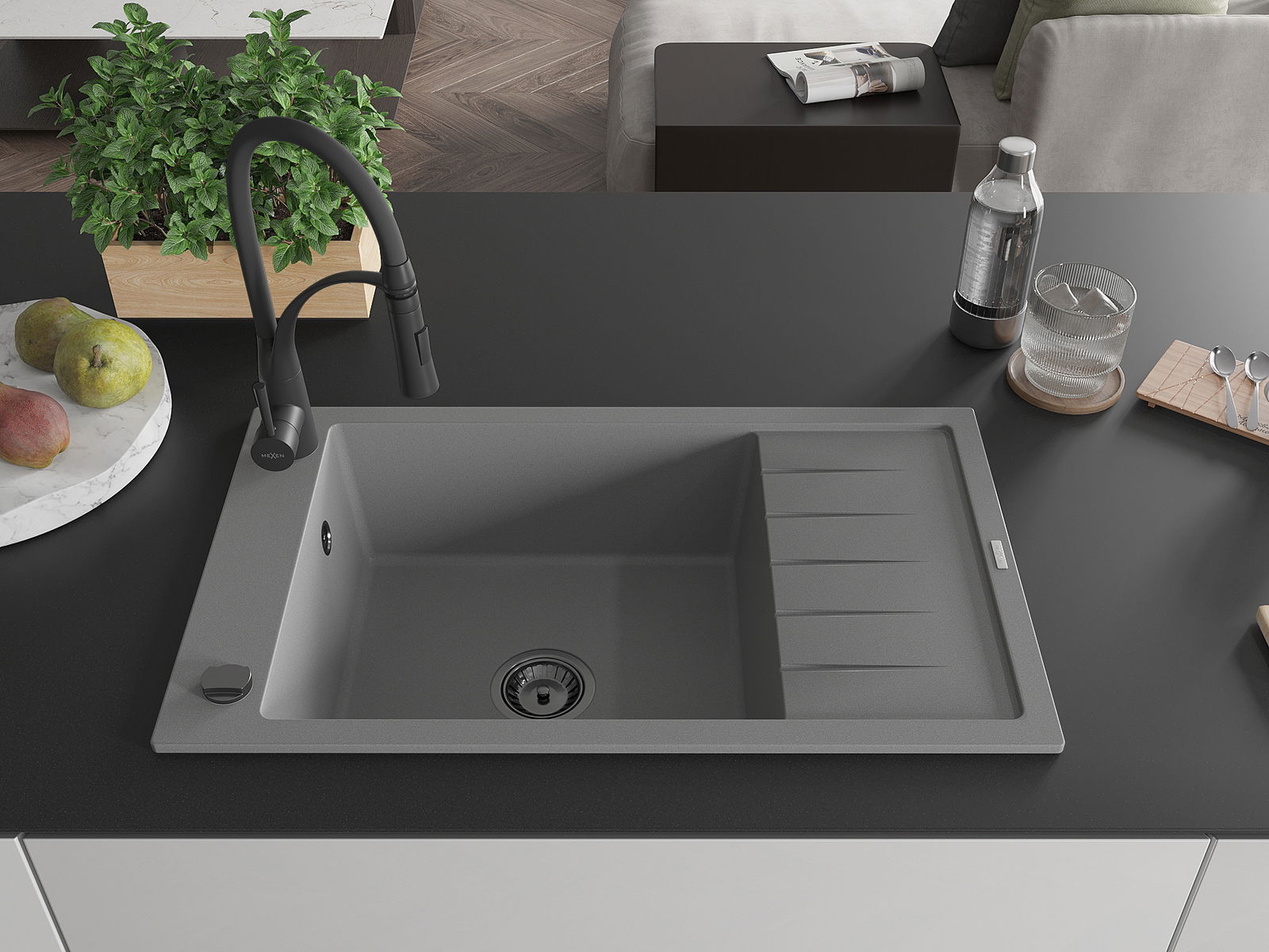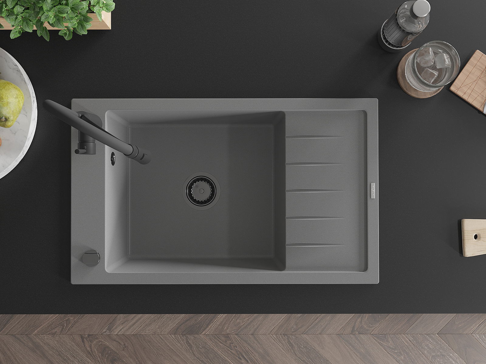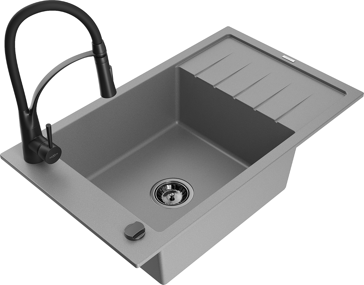 Mexen Elias zlewozmywak granitowy 1-komorowy z ociekaczem i baterią kuchenną Aster, szary - 6511-71-73450-70-B