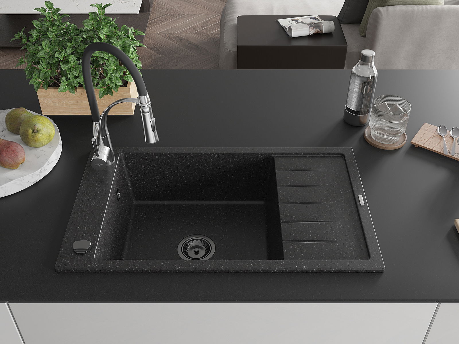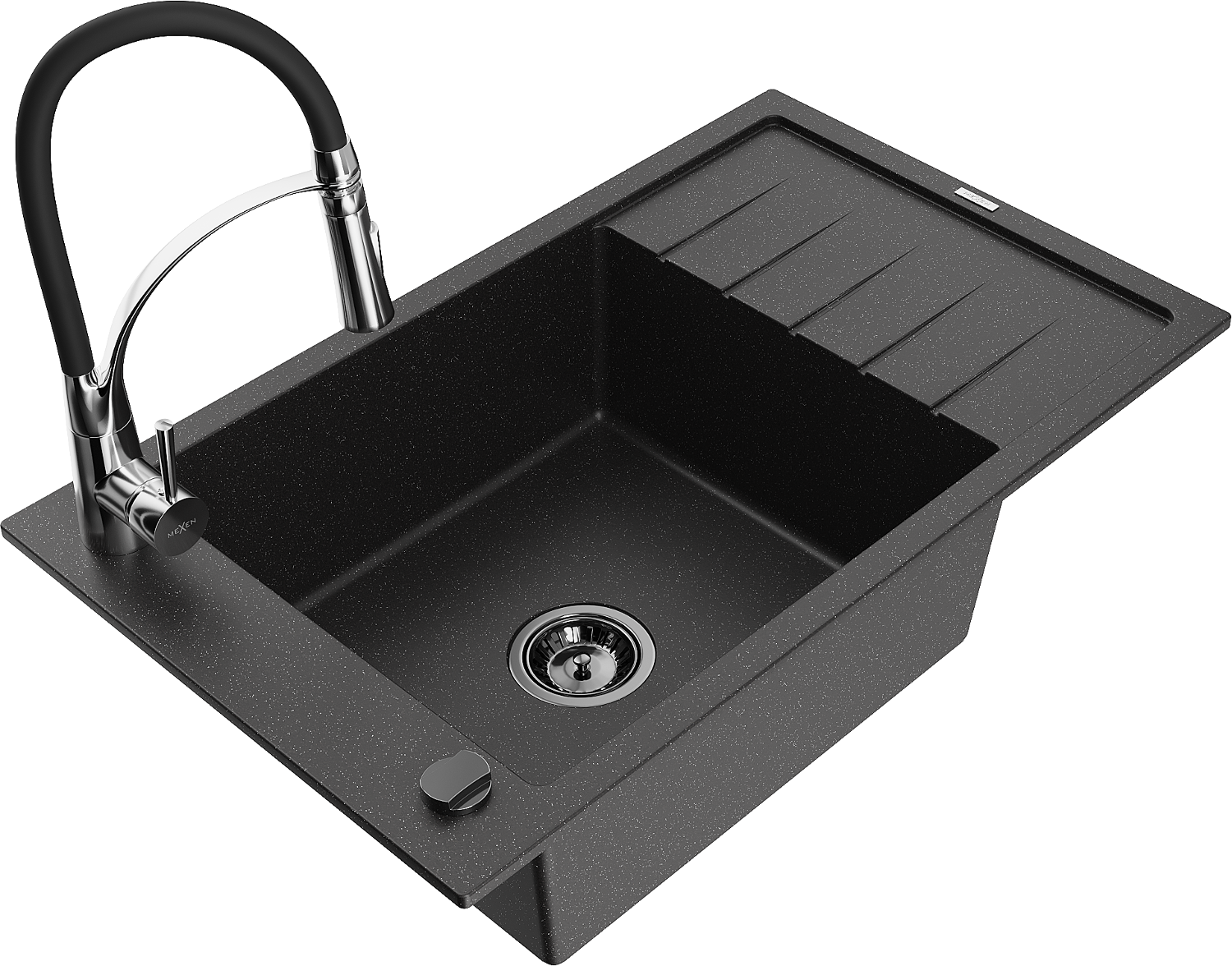Mexen Elias zlewozmywak granitowy 1-komorowy z ociekaczem i baterią kuchenną Aster, czarny/srebrny metalik - 6511-73-73450-07-B