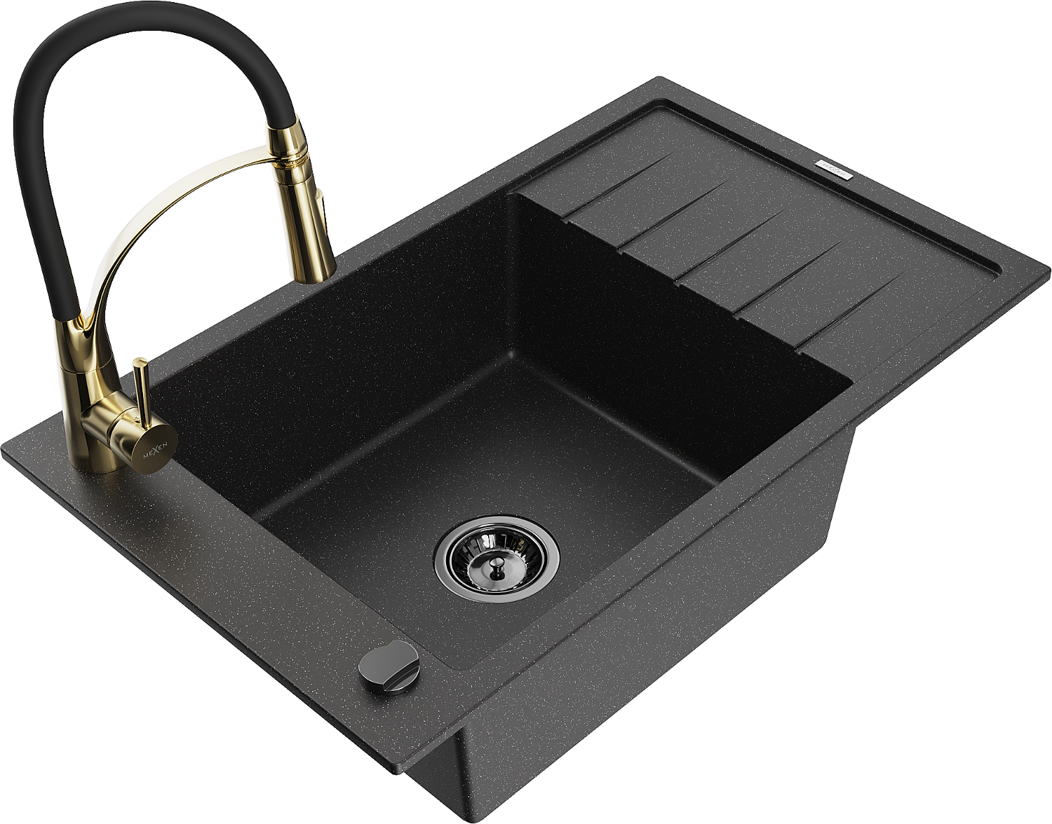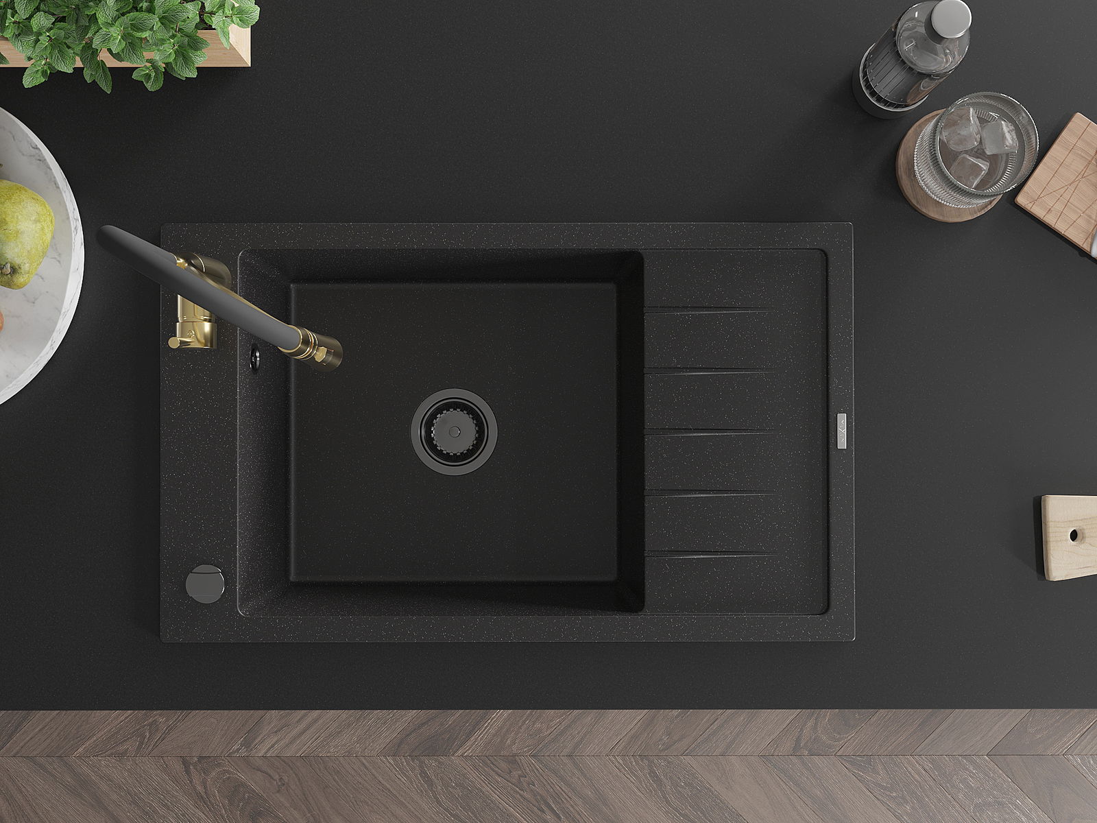 Mexen Elias zlewozmywak granitowy 1-komorowy z ociekaczem i baterią kuchenną Aster, czarny/srebrny metalik - 6511-73-73450-57-B