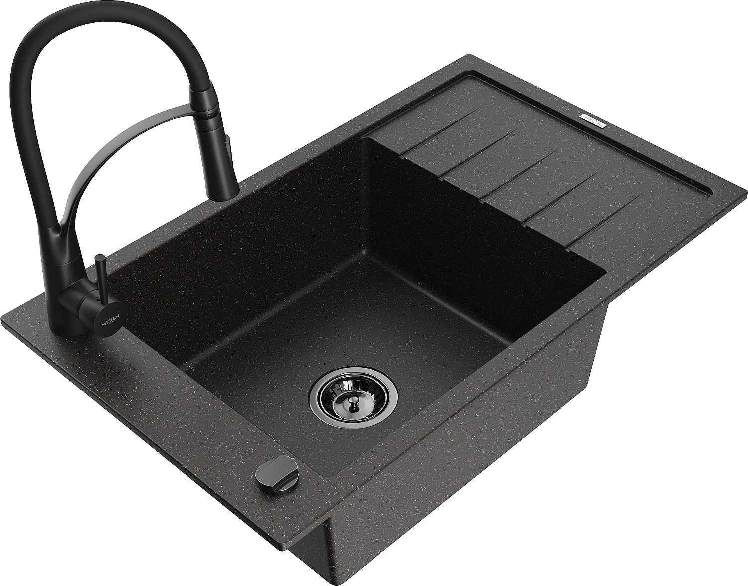 Mexen Elias zlewozmywak granitowy 1-komorowy z ociekaczem i baterią kuchenną Aster, czarny/srebrny metalik - 6511-73-73450-70-B