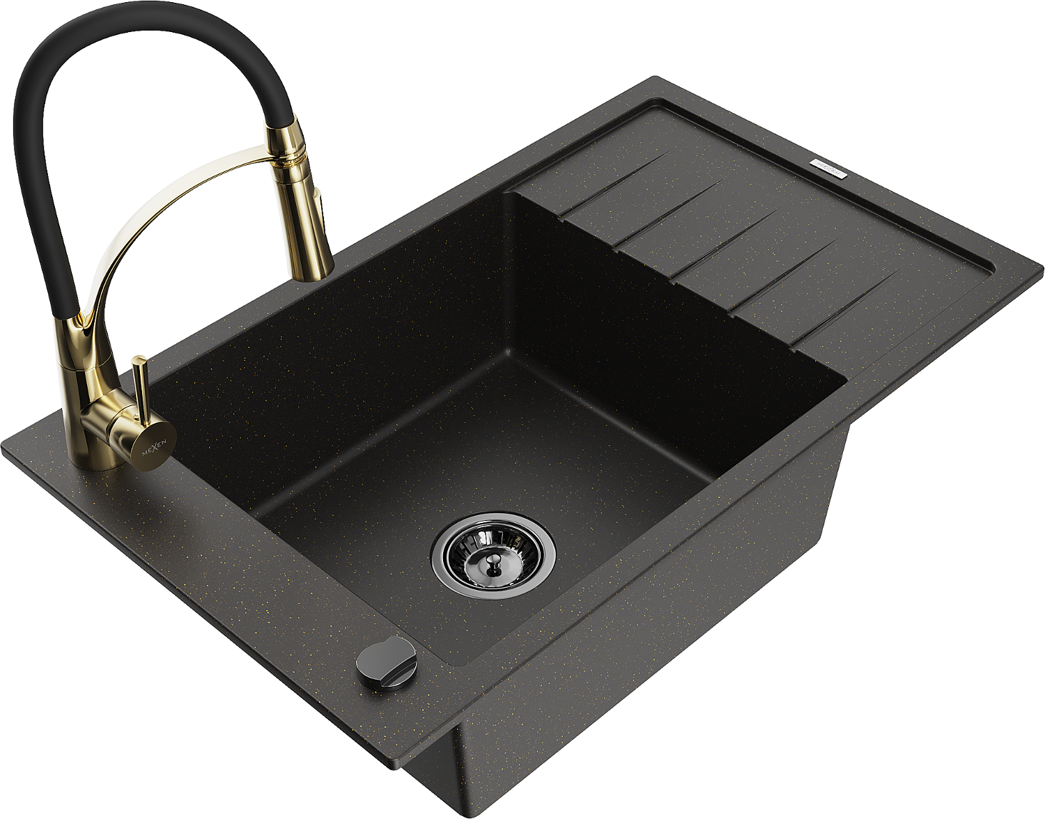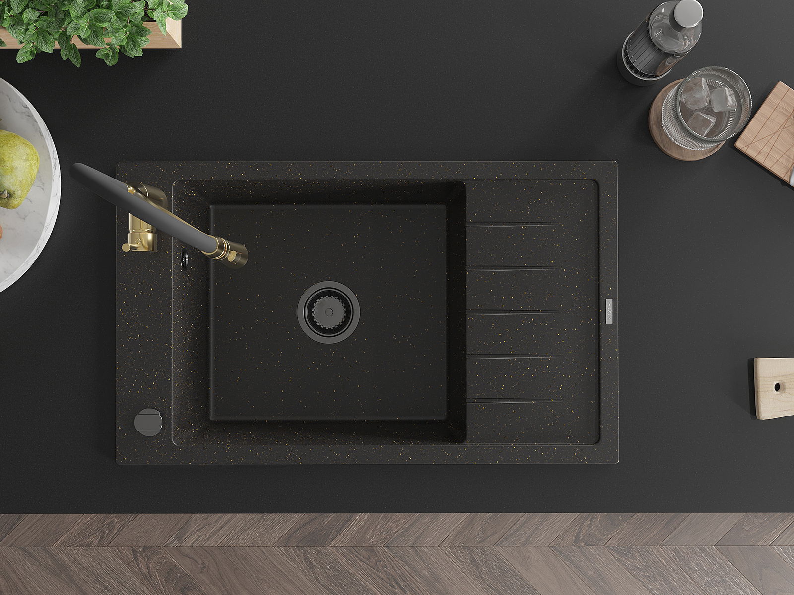 Mexen Elias zlewozmywak granitowy 1-komorowy z ociekaczem i baterią kuchenną Aster, czarny/złoty metalik - 6511-75-73450-57-B