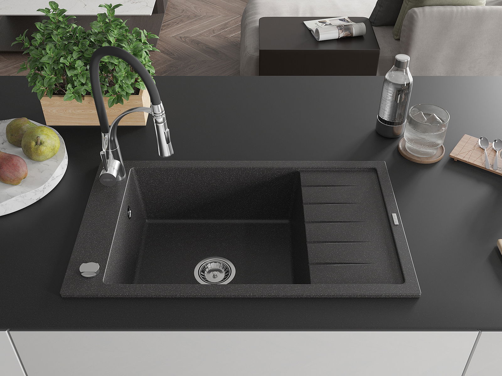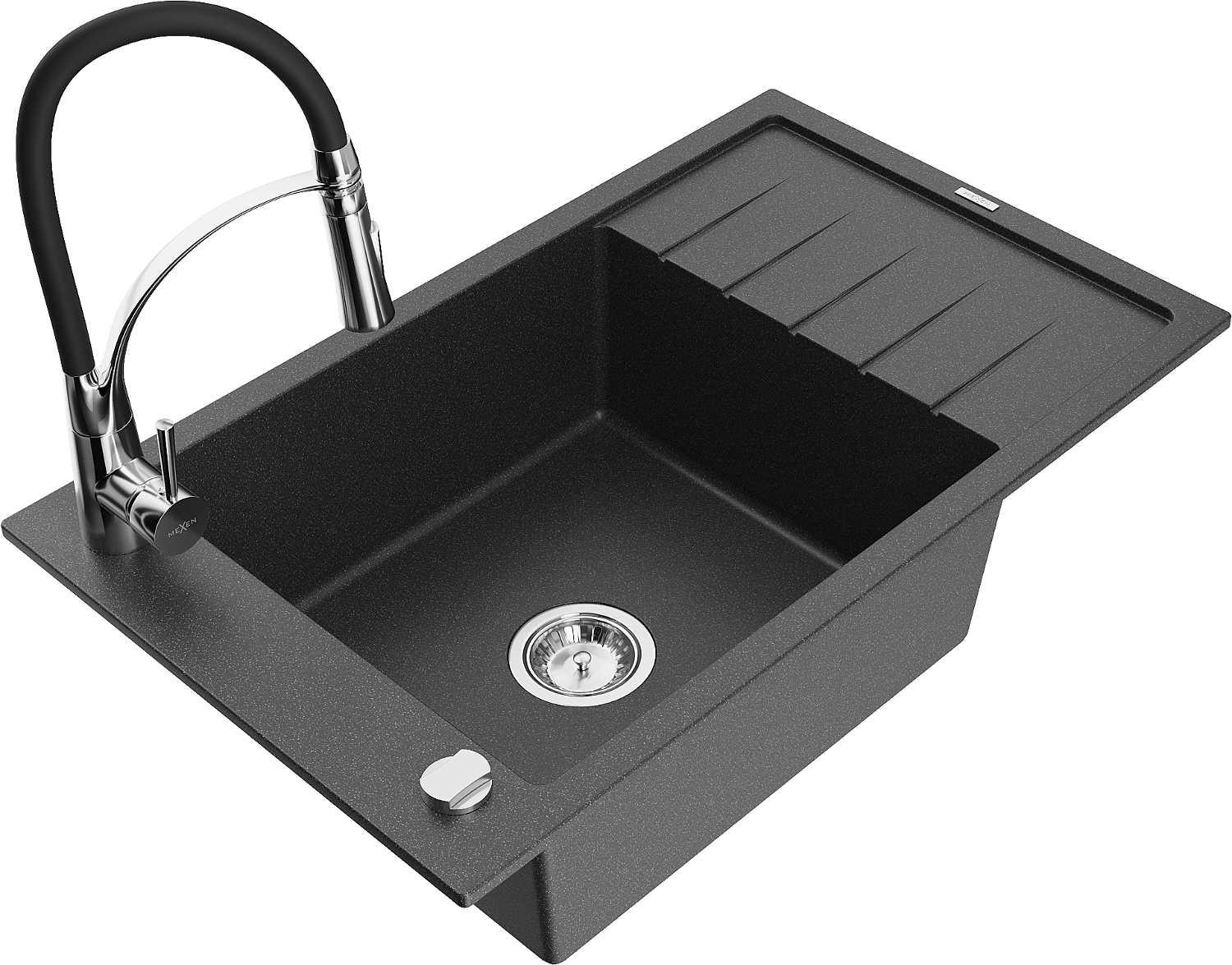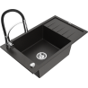 Mexen Elias zlewozmywak granitowy 1-komorowy z ociekaczem i baterią kuchenną Aster, czarny nakrapiany - 6511-76-73450-07