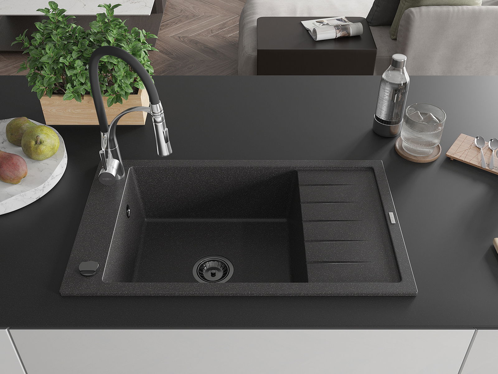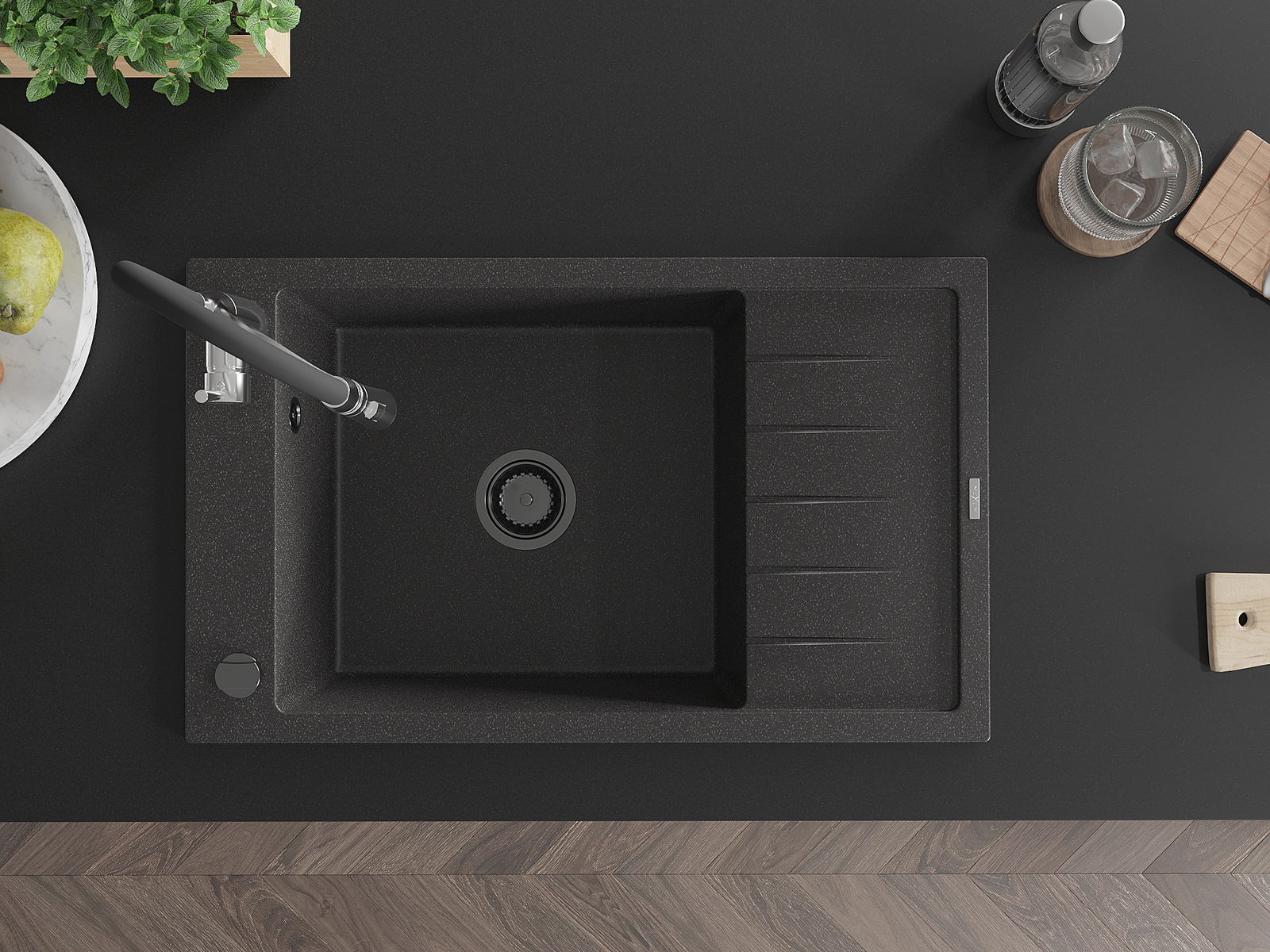Mexen Elias zlewozmywak granitowy 1-komorowy z ociekaczem i baterią kuchenną Aster, czarny nakrapiany - 6511-76-73450-07-B