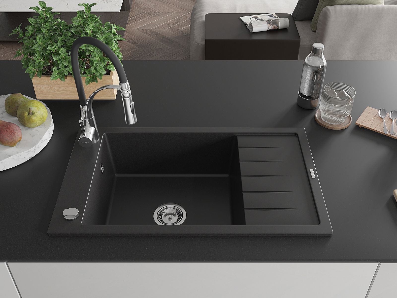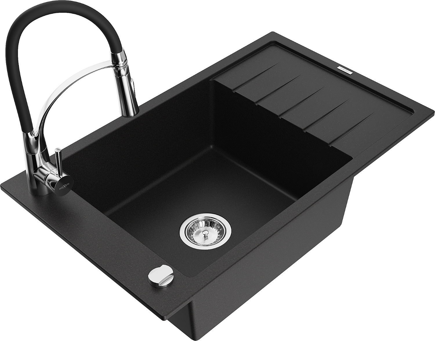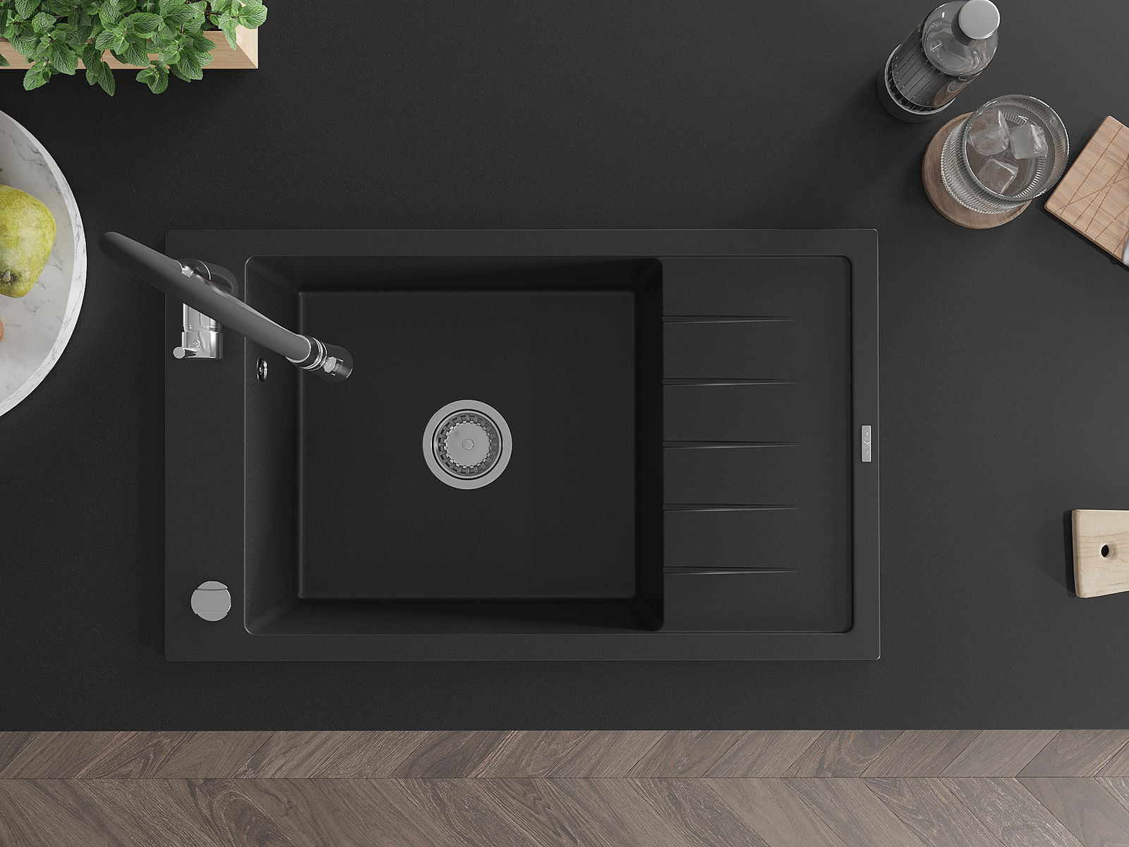 Mexen Elias zlewozmywak granitowy 1-komorowy z ociekaczem i baterią kuchenną Aster, czarny - 6511-77-73450-07