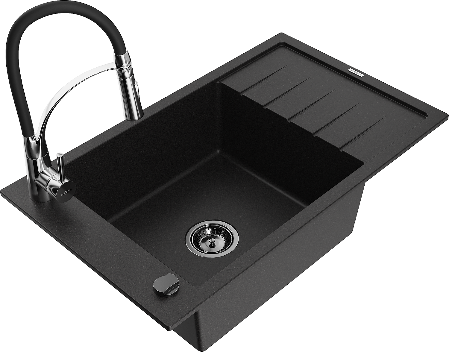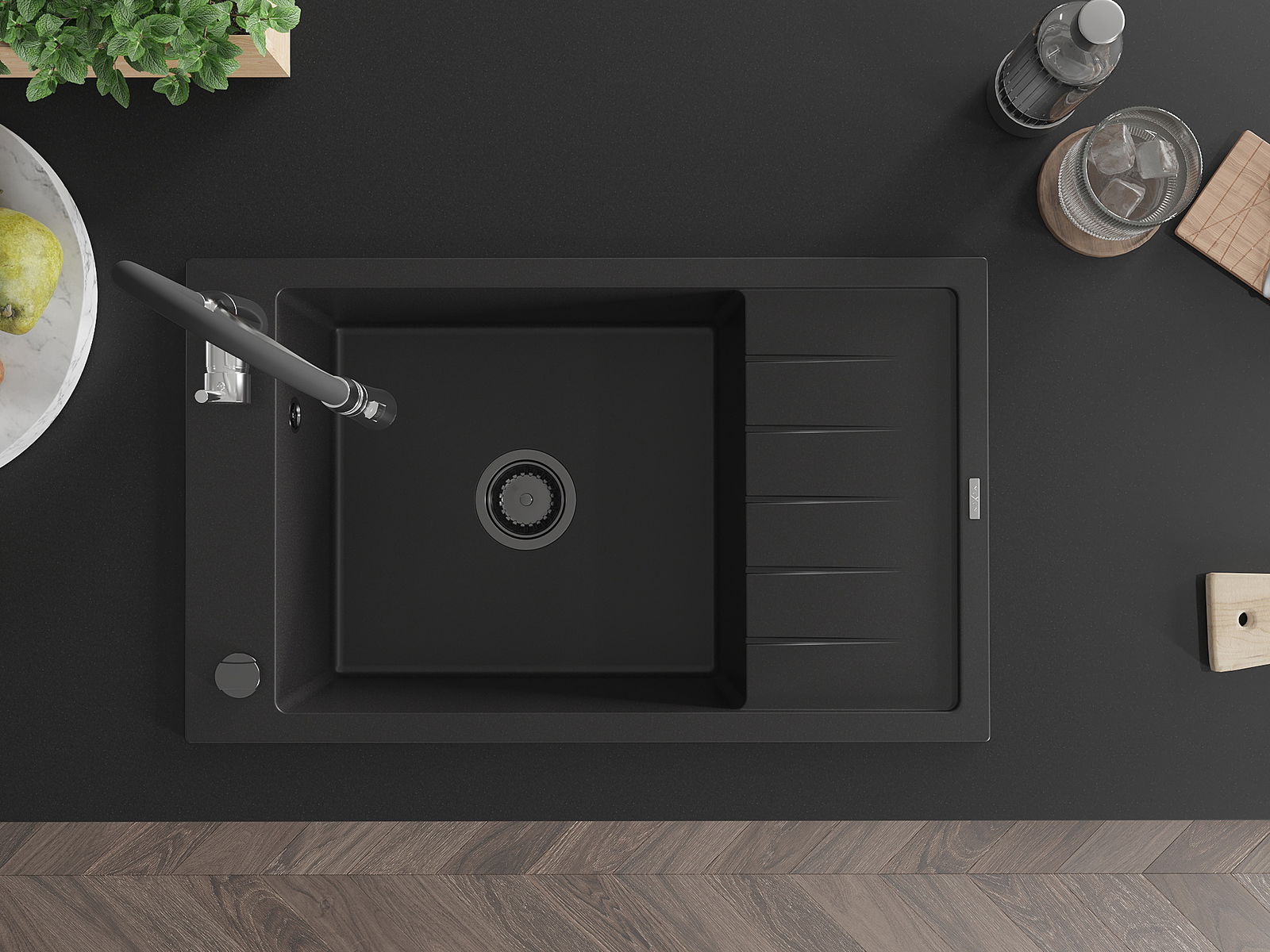 Mexen Elias zlewozmywak granitowy 1-komorowy z ociekaczem i baterią kuchenną Aster, czarny - 6511-77-73450-07-B