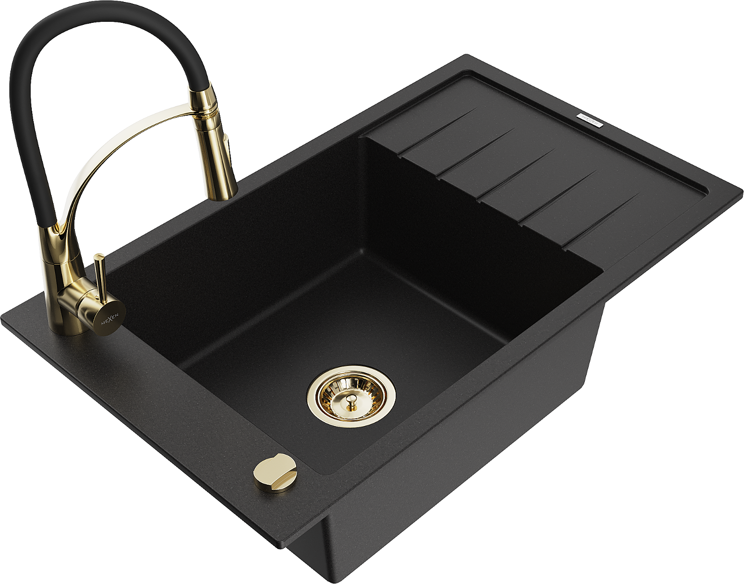 Mexen Elias zlewozmywak granitowy 1-komorowy z ociekaczem i baterią kuchenną Aster, czarny - 6511-77-73450-57-G