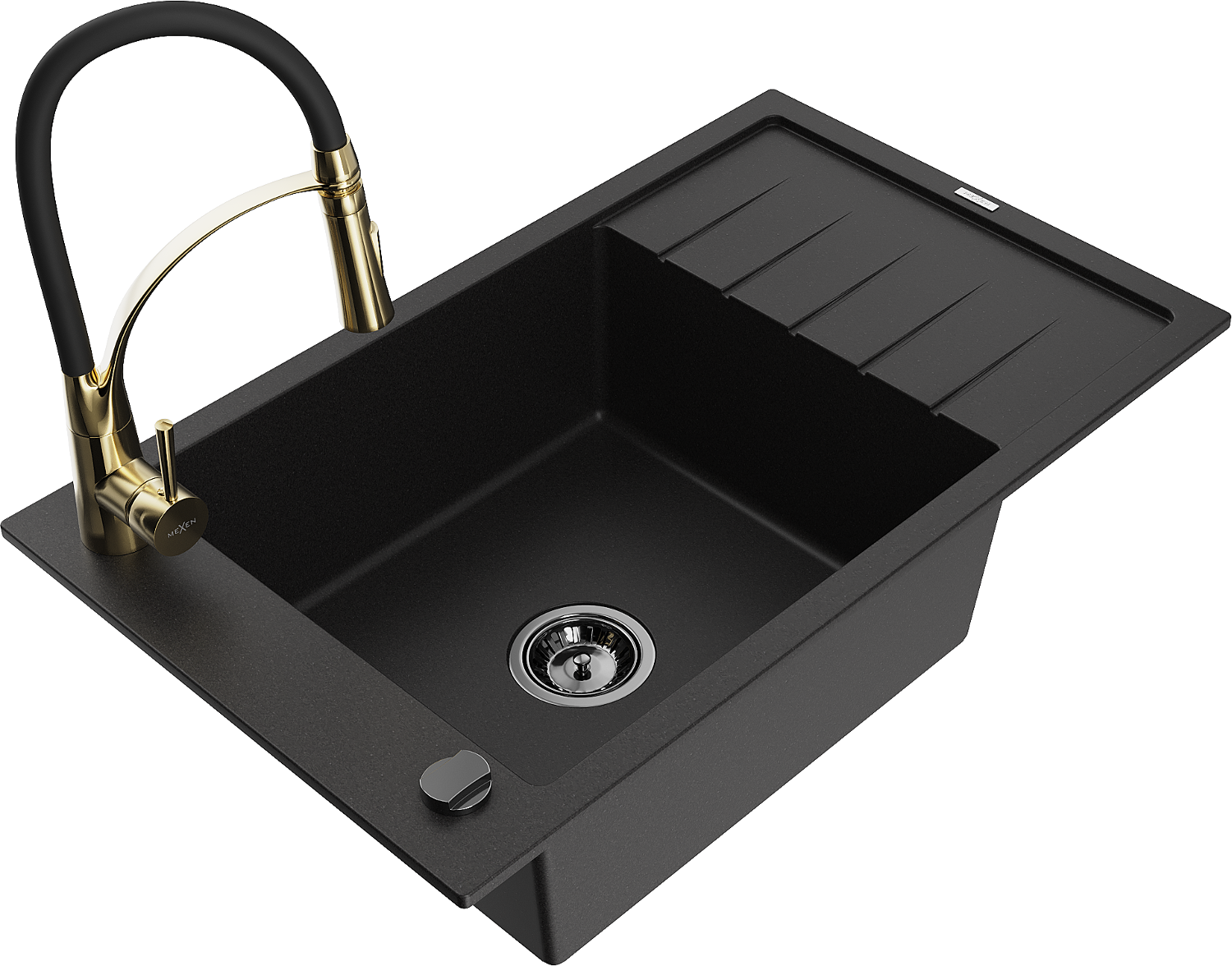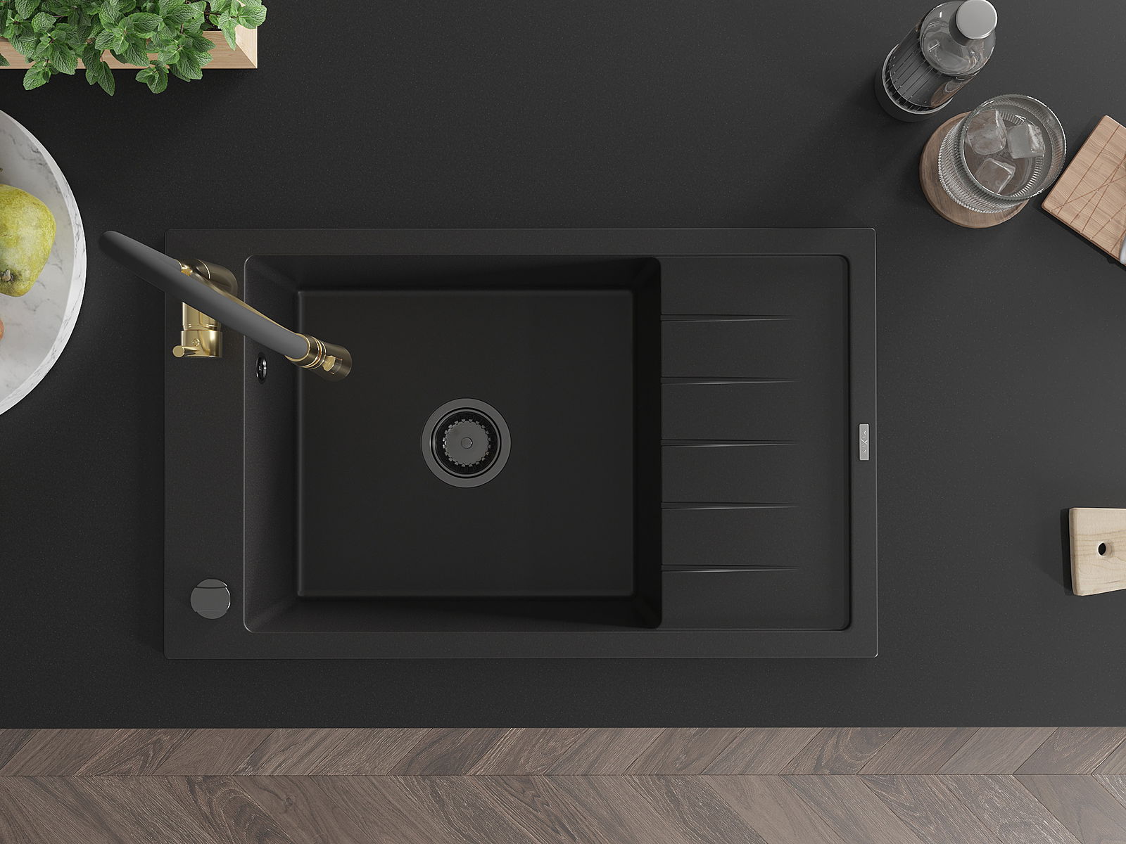 Mexen Elias zlewozmywak granitowy 1-komorowy z ociekaczem i baterią kuchenną Aster, czarny - 6511-77-73450-57-B