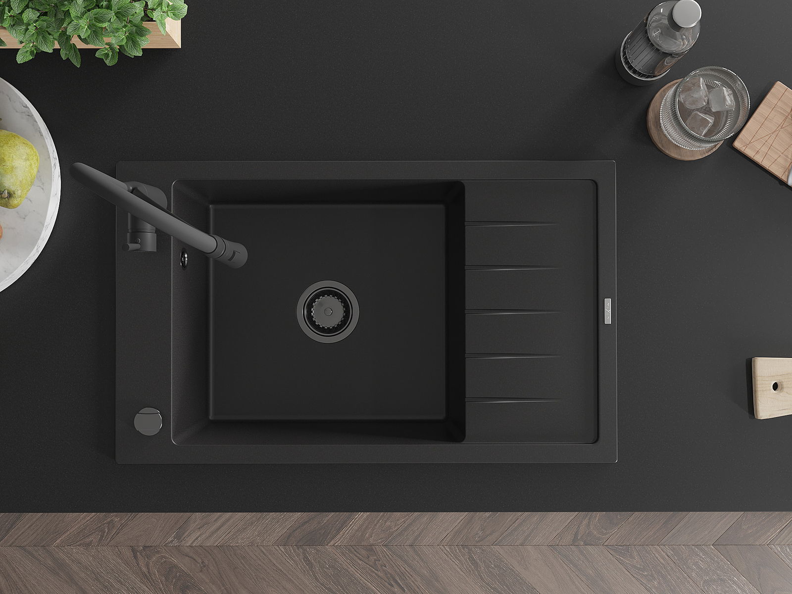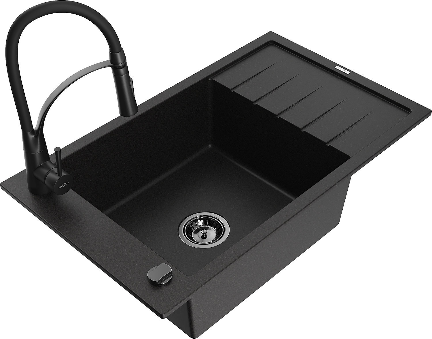 Mexen Elias zlewozmywak granitowy 1-komorowy z ociekaczem i baterią kuchenną Aster, czarny - 6511-77-73450-70-B
